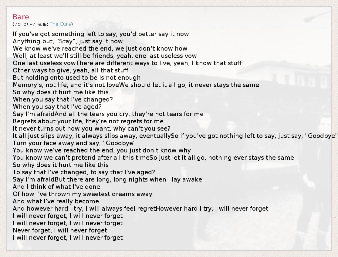 If you've got something left to say, you'd better say it now Anything but, "Stay", just say it now We know we've reached the end, we just don't know how Well, at least we'll still be friends, yeah, one last useless vow One last useless vowThere are different ways to live, yeah, I know that stuff Other ways to give, yeah, all that stuff But holding onto used to be is not enough Memory's, not life, and it's not loveWe should let it all go, it never stays the same So why does it hurt me like this When you say that I've changed? When you say that I've aged? Say I'm afraidAnd all the tears you cry, they're not tears for me Regrets about your life, they're not regrets for me It never turns out how you want, why can't you see? It all just slips away, it always slips away, eventuallySo if you've got nothing left to say, just say, "Goodbye" Turn your face away and say, "Goodbye" You know we've reached the end, you just don't know why You know we can't pretend after all this timeSo just let it all go, nothing ever stays the same So why does it hurt me like this To say that I've changed, to say that I've aged? Say I'm afraidBut there are long, long nights when I lay awake And I think of what I've done Of how I've thrown my sweetest dreams away And what I've really become And however hard I try, I will always feel regretHowever hard I try, I will never forget I will never forget, I will never forget I will never forget, I will never forget Never forget, I will never forget I will never forget, I will never forget