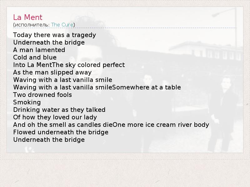 Today there was a tragedy Underneath the bridge A man lamented Cold and blue Into La MentThe sky colored perfect As the man slipped away Waving with a last vanilla smile Waving with a last vanilla smileSomewhere at a table Two drowned fools Smoking Drinking water as they talked Of how they loved our lady And oh the smell as candles dieOne more ice cream river body Flowed underneath the bridge Underneath the bridge