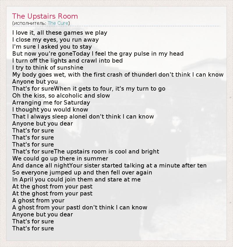 I love it, all these games we play I close my eyes, you run away I'm sure I asked you to stay But now you're goneToday I feel the gray pulse in my head I turn off the lights and crawl into bed I try to think of sunshine My body goes wet, with the first crash of thunderI don't think I can know Anyone but you That's for sureWhen it gets to four, it's my turn to go Oh the kiss, so alcoholic and slow Arranging me for Saturday I thought you would know That I always sleep aloneI don't think I can know Anyone but you dear That's for sure That's for sure That's for sure That's for sureThe upstairs room is cool and bright We could go up there in summer And dance all nightYour sister started talking at a minute after ten So everyone jumped up and then fell over again In April you could join them and stare at me At the ghost from your past At the ghost from your past A ghost from your A ghost from your pastI don't think I can know Anyone but you dear That's for sure That's for sure