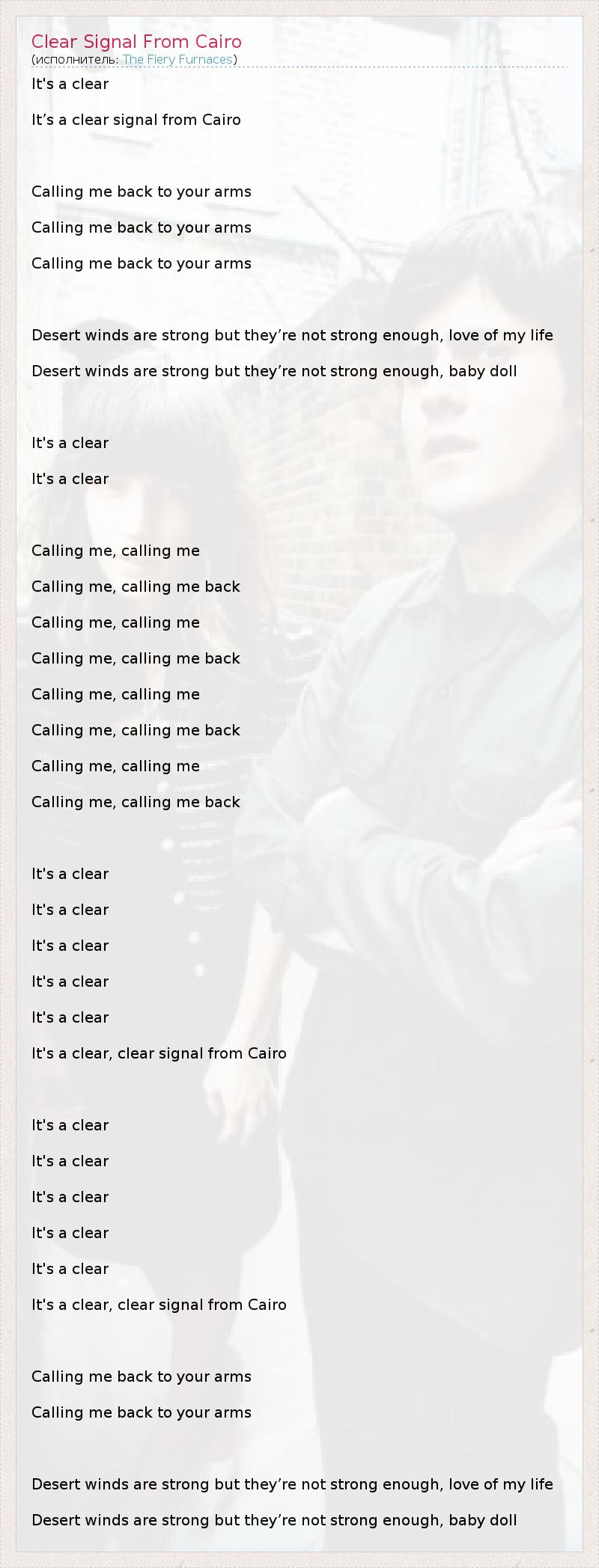 It's a clear It’s a clear signal from Cairo Calling me back to your arms Calling me back to your arms Calling me back to your arms Desert winds are strong but they’re not strong enough, love of my life Desert winds are strong but they’re not strong enough, baby doll It's a clear It's a clear Calling me, calling me Calling me, calling me back Calling me, calling me Calling me, calling me back Calling me, calling me Calling me, calling me back Calling me, calling me Calling me, calling me back It's a clear It's a clear It's a clear It's a clear It's a clear It's a clear, clear signal from Cairo It's a clear It's a clear It's a clear It's a clear It's a clear It's a clear, clear signal from Cairo Calling me back to your arms Calling me back to your arms Desert winds are strong but they’re not strong enough, love of my life Desert winds are strong but they’re not strong enough, baby doll