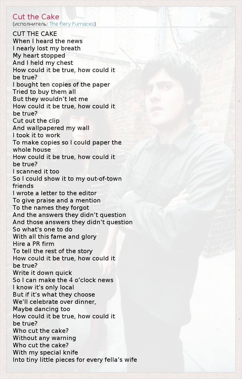 CUT THE CAKE When I heard the news I nearly lost my breath My heart stopped And I held my chest How could it be true, how could it be true? I bought ten copies of the paper Tried to buy them all But they wouldn't let me How could it be true, how could it be true? Cut out the clip And wallpapered my wall I took it to work To make copies so I could paper the whole house How could it be true, how could it be true? I scanned it too So I could show it to my out-of-town friends I wrote a letter to the editor To give praise and a mention To the names they forgot And the answers they didn't question And those answers they didn't question So what's one to do With all this fame and glory Hire a PR firm To tell the rest of the story How could it be true, how could it be true? Write it down quick So I can make the 4 o'clock news I know it's only local But if it's what they choose We'll celebrate over dinner, Maybe dancing too How could it be true, how could it be true? Who cut the cake? Without any warning Who cut the cake? With my special knife Into tiny little pieces for every fella's wife