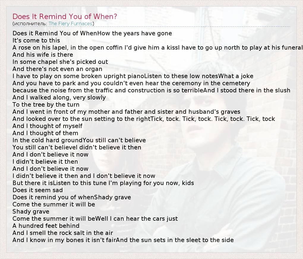 Does it Remind You of WhenHow the years have gone It's come to this A rose on his lapel, in the open coffin I'd give him a kissI have to go up north to play at his funeral And his wife is there In some chapel she's picked out And there's not even an organ I have to play on some broken upright pianoListen to these low notesWhat a joke And you have to park and you couldn't even hear the ceremony in the cemetery because the noise from the traffic and construction is so terribleAnd I stood there in the slush And I walked along, very slowly To the tree by the turn And I went in front of my mother and father and sister and husband's graves And looked over to the sun setting to the rightTick, tock. Tick, tock. Tick, tock. Tick, tock And I thought of myself And I thought of them In the cold hard groundYou still can't believe You still can't believeI didn't believe it then And I don't believe it now I didn't believe it then And I don't believe it now I didn't believe it then and I don't believe it now But there it isListen to this tune I'm playing for you now, kids Does it seem sad Does it remind you of whenShady grave Come the summer it will be Shady grave Come the summer it will beWell I can hear the cars just A hundred feet behind And I smell the rock salt in the air And I know in my bones it isn't fairAnd the sun sets in the sleet to the side