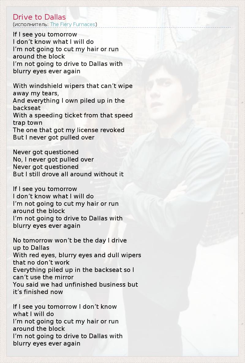 If I see you tomorrow I don’t know what I will do I’m not going to cut my hair or run around the block I’m not going to drive to Dallas with blurry eyes ever again With windshield wipers that can’t wipe away my tears, And everything I own piled up in the backseat With a speeding ticket from that speed trap town The one that got my license revoked But I never got pulled over Never got questioned No, I never got pulled over Never got questioned But I still drove all around without it If I see you tomorrow I don’t know what I will do I’m not going to cut my hair or run around the block I’m not going to drive to Dallas with blurry eyes ever again No tomorrow won’t be the day I drive up to Dallas With red eyes, blurry eyes and dull wipers that no don’t work Everything piled up in the backseat so I can’t use the mirror You said we had unfinished business but it’s finished now If I see you tomorrow I don’t know what I will do I’m not going to cut my hair or run around the block I’m not going to drive to Dallas with blurry eyes ever again