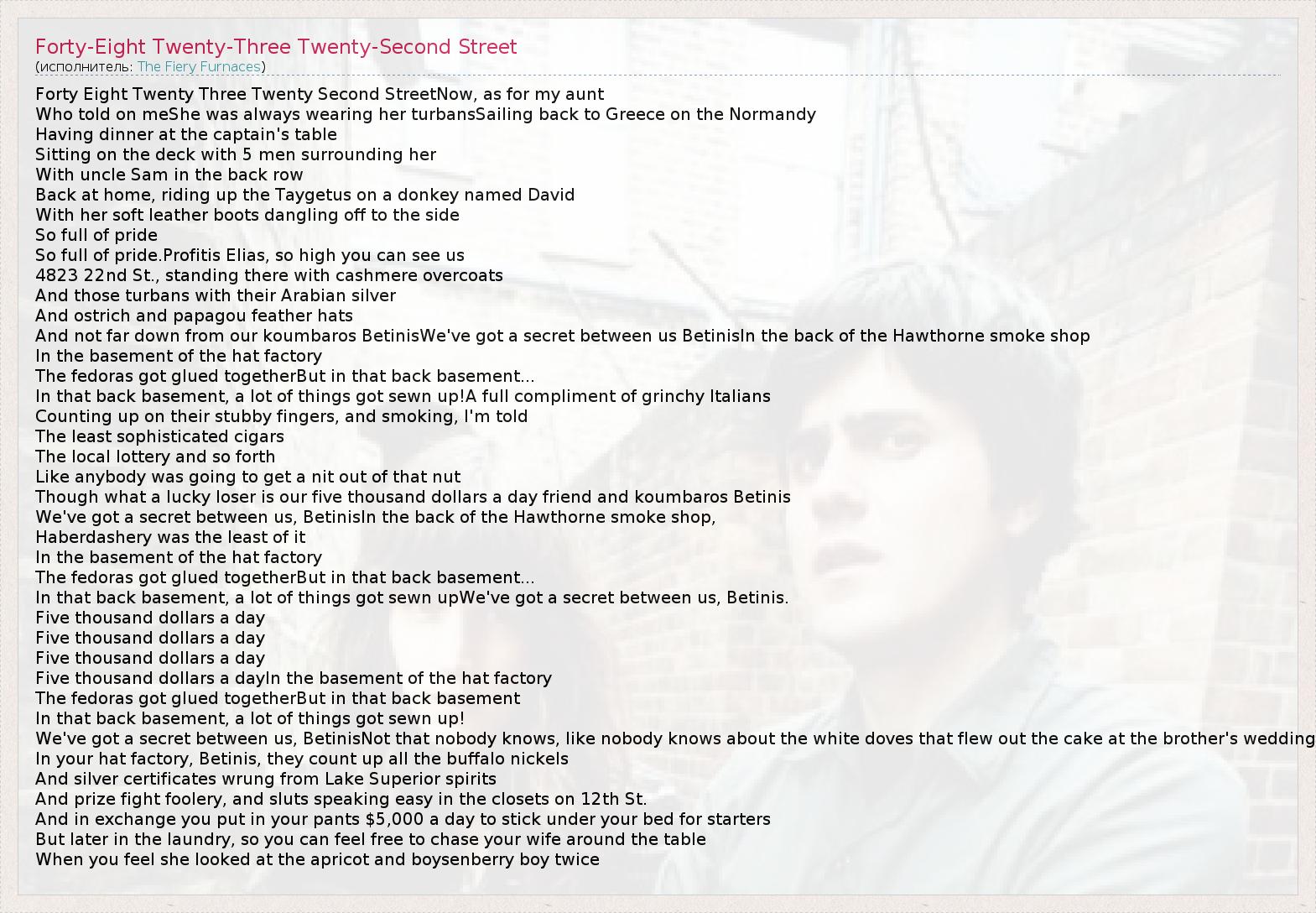 А как ты думаешь, о чем песня "Forty-Eight Twenty-Three Twenty-Second Street" ?