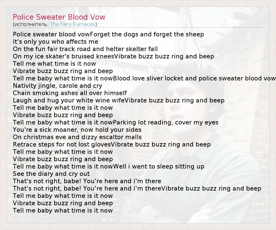 Police sweater blood vowForget the dogs and forget the sheep It's only you who affects me On the fun fair track road and helter skelter fall On my ice skater's bruised kneesVibrate buzz buzz ring and beep Tell me what time is it now Vibrate buzz buzz ring and beep Tell me baby what time is it nowBlood love sliver locket and police sweater blood vow Nativity jingle, carole and cry Chain smoking ashes all over himself Laugh and hug your white wine wifeVibrate buzz buzz ring and beep Tell me baby what time is it now Vibrate buzz buzz ring and beep Tell me baby what time is it nowParking lot reading, cover my eyes You're a sick moaner, now hold your sides On christmas eve and dizzy escaltor malls Retrace steps for not lost glovesVibrate buzz buzz ring and beep Tell me baby what time is it now Vibrate buzz buzz ring and beep Tell me baby what time is it nowWell i went to sleep sitting up See the diary and cry out That's not right, babe! You're here and i'm there That's not right, babe! You're here and i'm thereVibrate buzz buzz ring and beep Tell me baby what time is it now Vibrate buzz buzz ring and beep Tell me baby what time is it now