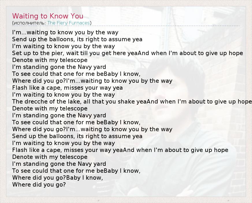I'm...waiting to know you by the way Send up the balloons, its right to assume yea I'm waiting to know you by the way Set up to the pier, wait till you get here yeaAnd when I'm about to give up hope Denote with my telescope I'm standing gone the Navy yard To see could that one for me beBaby I know, Where did you go?I'm...waiting to know you by the way Flash like a cape, misses your way yea I'm waiting to know you by the way The drecche of the lake, all that you shake yeaAnd when I'm about to give up hope Denote with my telescope I'm standing gone the Navy yard To see could that one for me beBaby I know, Where did you go?I'm...waiting to know you by the way Send up the balloons, its right to assume yea I'm waiting to know you by the way Flash like a cape, misses your way yeaAnd when I'm about to give up hope Denote with my telescope I'm standing gone the Navy yard To see could that one for me beBaby I know, Where did you go?Baby I know, Where did you go?
