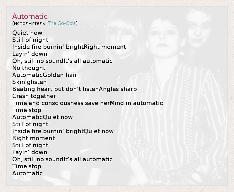 Quiet now Still of night Inside fire burnin' brightRight moment Layin' down Oh, still no soundIt's all automatic No thought AutomaticGolden hair Skin glisten Beating heart but don't listenAngles sharp Crash together Time and consciousness save herMind in automatic Time stop AutomaticQuiet now Still of night Inside fire burnin' brightQuiet now Right moment Still of night Layin' down Oh, still no soundIt's all automatic Time stop Automatic