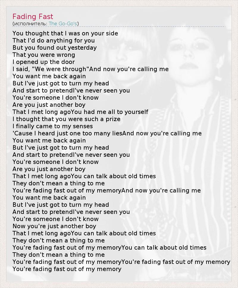 You thought that I was on your side That I'd do anything for you But you found out yesterday That you were wrong I opened up the door I said, "We were through"And now you're calling me You want me back again But I've just got to turn my head And start to pretendI've never seen you You're someone I don't know Are you just another boy That I met long agoYou had me all to yourself I thought that you were such a prize I finally came to my senses 'Cause I heard just one too many liesAnd now you're calling me You want me back again But I've just got to turn my head And start to pretendI've never seen you You're someone I don't know Are you just another boy That I met long agoYou can talk about old times They don't mean a thing to me You're fading fast out of my memoryAnd now you're calling me You want me back again But I've just got to turn my head And start to pretendI've never seen you You're someone I don't know Now you're just another boy That I met long agoYou can talk about old times They don't mean a thing to me You're fading fast out of my memoryYou can talk about old times They don't mean a thing to me You're fading fast out of my memoryYou're fading fast out of my memory You're fading fast out of my memory