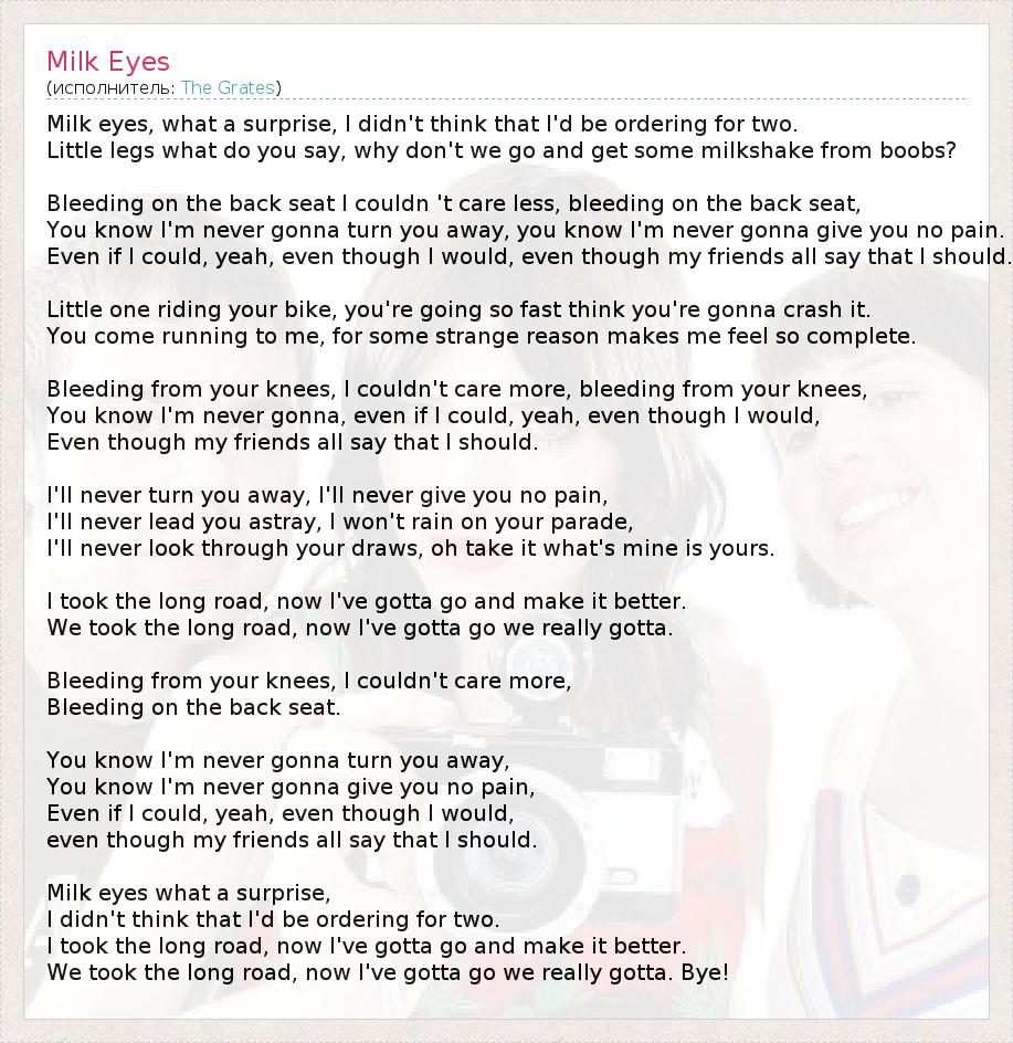 Milk eyes, what a surprise, I didn't think that I'd be ordering for two. Little legs what do you say, why don't we go and get some milkshake from boobs? Bleeding on the back seat I couldn 't care less, bleeding on the back seat, You know I'm never gonna turn you away, you know I'm never gonna give you no pain. Even if I could, yeah, even though I would, even though my friends all say that I should. Little one riding your bike, you're going so fast think you're gonna crash it. You come running to me, for some strange reason makes me feel so complete. Bleeding from your knees, I couldn't care more, bleeding from your knees, You know I'm never gonna, even if I could, yeah, even though I would, Even though my friends all say that I should. I'll never turn you away, I'll never give you no pain, I'll never lead you astray, I won't rain on your parade, I'll never look through your draws, oh take it what's mine is yours. I took the long road, now I've gotta go and make it better. We took the long road, now I've gotta go we really gotta. Bleeding from your knees, I couldn't care more, Bleeding on the back seat. You know I'm never gonna turn you away, You know I'm never gonna give you no pain, Even if I could, yeah, even though I would, even though my friends all say that I should. Milk eyes what a surprise, I didn't think that I'd be ordering for two. I took the long road, now I've gotta go and make it better. We took the long road, now I've gotta go we really gotta. Bye!