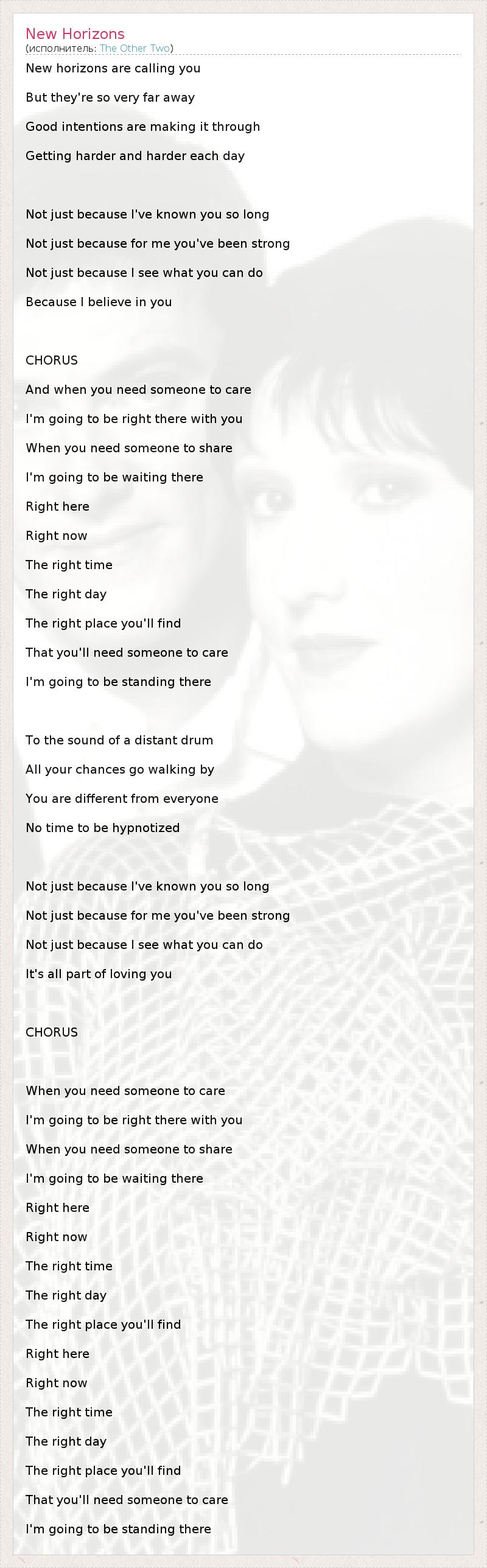 New horizons are calling you But they're so very far away Good intentions are making it through Getting harder and harder each day Not just because I've known you so long Not just because for me you've been strong Not just because I see what you can do Because I believe in you CHORUS And when you need someone to care I'm going to be right there with you When you need someone to share I'm going to be waiting there Right here Right now The right time The right day The right place you'll find That you'll need someone to care I'm going to be standing there To the sound of a distant drum All your chances go walking by You are different from everyone No time to be hypnotized Not just because I've known you so long Not just because for me you've been strong Not just because I see what you can do It's all part of loving you CHORUS When you need someone to care I'm going to be right there with you When you need someone to share I'm going to be waiting there Right here Right now The right time The right day The right place you'll find Right here Right now The right time The right day The right place you'll find That you'll need someone to care I'm going to be standing there