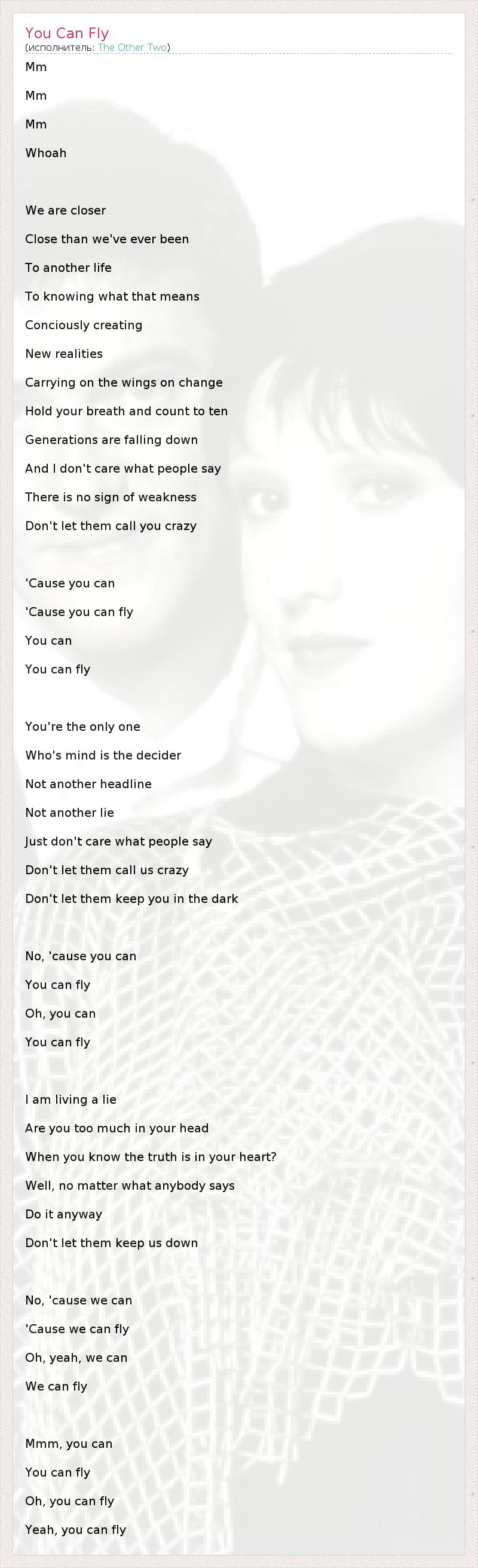 Mm Mm Mm Whoah We are closer Close than we've ever been To another life To knowing what that means Conciously creating New realities Carrying on the wings on change Hold your breath and count to ten Generations are falling down And I don't care what people say There is no sign of weakness Don't let them call you crazy 'Cause you can 'Cause you can fly You can You can fly You're the only one Who's mind is the decider Not another headline Not another lie Just don't care what people say Don't let them call us crazy Don't let them keep you in the dark No, 'cause you can You can fly Oh, you can You can fly I am living a lie Are you too much in your head When you know the truth is in your heart? Well, no matter what anybody says Do it anyway Don't let them keep us down No, 'cause we can 'Cause we can fly Oh, yeah, we can We can fly Mmm, you can You can fly Oh, you can fly Yeah, you can fly