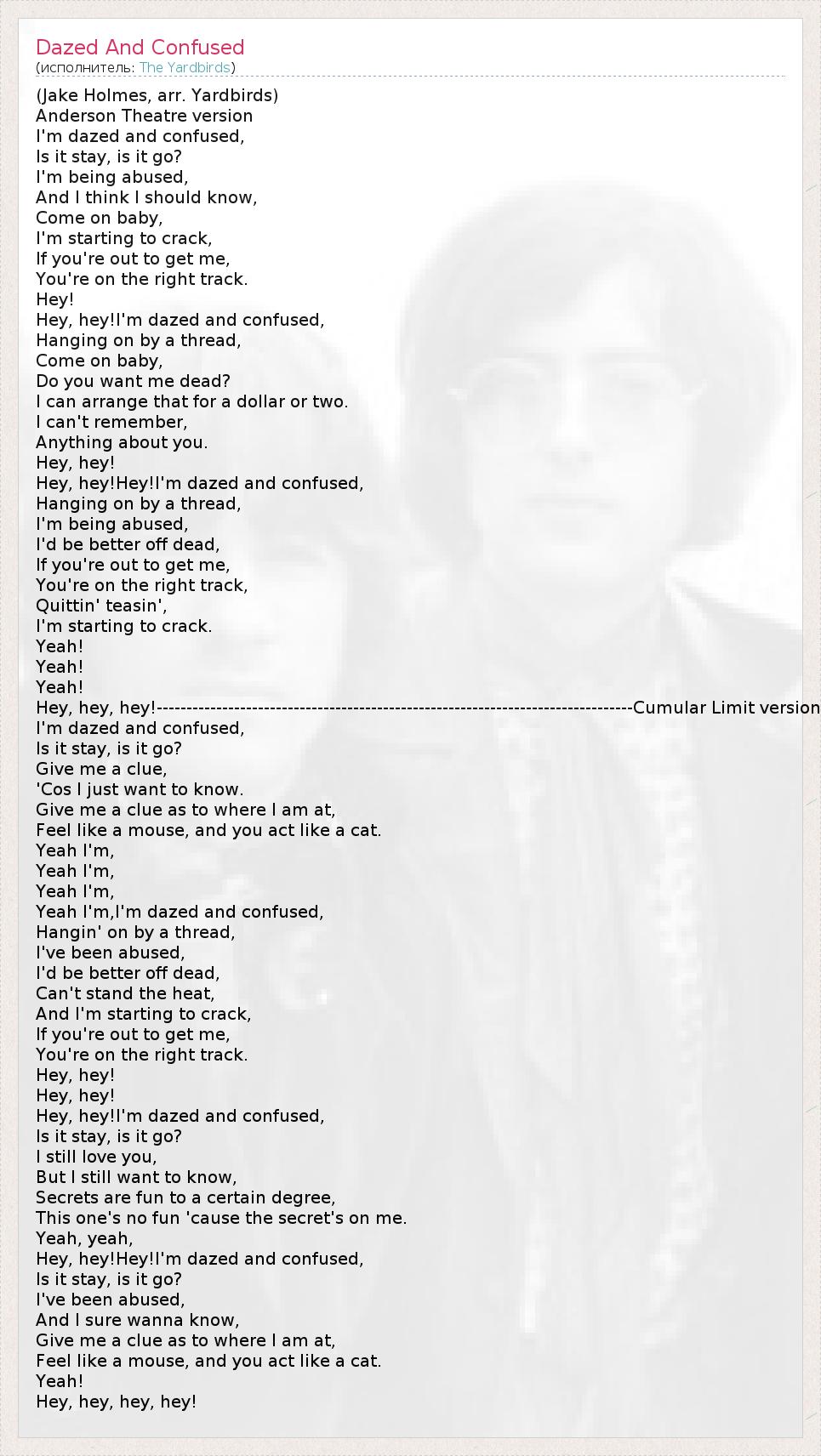 (Jake Holmes, arr. Yardbirds) Anderson Theatre version I'm dazed and confused, Is it stay, is it go? I'm being abused, And I think I should know, Come on baby, I'm starting to crack, If you're out to get me, You're on the right track. Hey! Hey, hey!I'm dazed and confused, Hanging on by a thread, Come on baby, Do you want me dead? I can arrange that for a dollar or two. I can't remember, Anything about you. Hey, hey! Hey, hey!Hey!I'm dazed and confused, Hanging on by a thread, I'm being abused, I'd be better off dead, If you're out to get me, You're on the right track, Quittin' teasin', I'm starting to crack. Yeah! Yeah! Yeah! Hey, hey, hey!--------------------------------------------------------------------------------Cumular Limit version I'm dazed and confused, Is it stay, is it go? Give me a clue, 'Cos I just want to know. Give me a clue as to where I am at, Feel like a mouse, and you act like a cat. Yeah I'm, Yeah I'm, Yeah I'm, Yeah I'm,I'm dazed and confused, Hangin' on by a thread, I've been abused, I'd be better off dead, Can't stand the heat, And I'm starting to crack, If you're out to get me, You're on the right track. Hey, hey! Hey, hey! Hey, hey!I'm dazed and confused, Is it stay, is it go? I still love you, But I still want to know, Secrets are fun to a certain degree, This one's no fun 'cause the secret's on me. Yeah, yeah, Hey, hey!Hey!I'm dazed and confused, Is it stay, is it go? I've been abused, And I sure wanna know, Give me a clue as to where I am at, Feel like a mouse, and you act like a cat. Yeah! Hey, hey, hey, hey!
