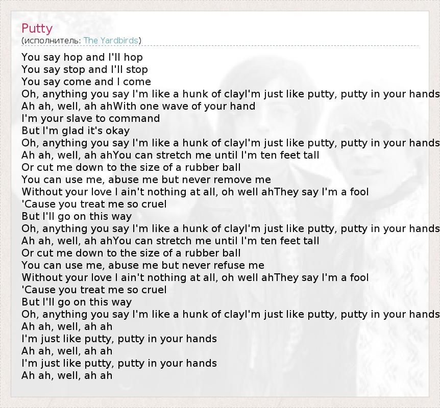 Oh, anything you say I'm like a hunk of clayI'm just like putty, putty in your hands
