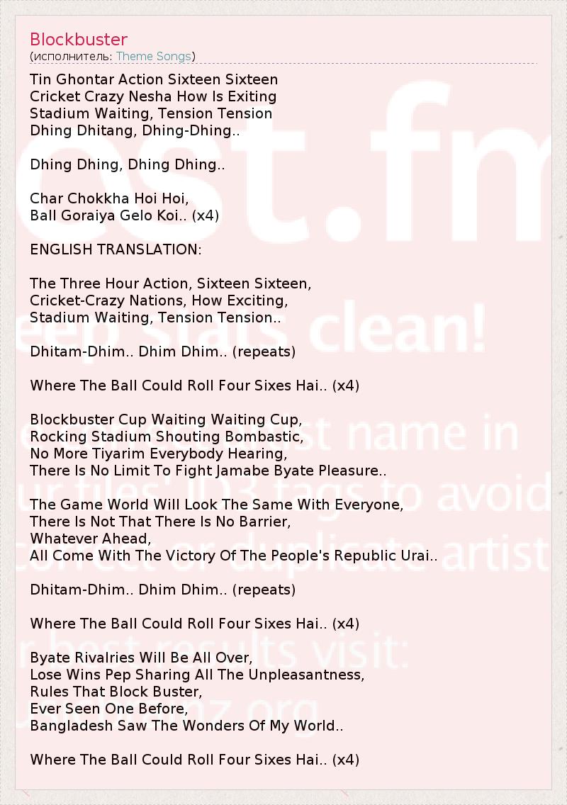 Tin Ghontar Action Sixteen Sixteen Cricket Crazy Nesha How Is Exiting Stadium Waiting, Tension Tension Dhing Dhitang, Dhing-Dhing.. Dhing Dhing, Dhing Dhing.. Char Chokkha Hoi Hoi, Ball Goraiya Gelo Koi.. (x4) ENGLISH TRANSLATION: The Three Hour Action, Sixteen Sixteen, Cricket-Crazy Nations, How Exciting, Stadium Waiting, Tension Tension.. Dhitam-Dhim.. Dhim Dhim.. (repeats) Where The Ball Could Roll Four Sixes Hai.. (x4) Blockbuster Cup Waiting Waiting Cup, Rocking Stadium Shouting Bombastic, No More Tiyarim Everybody Hearing, There Is No Limit To Fight Jamabe Byate Pleasure.. The Game World Will Look The Same With Everyone, There Is Not That There Is No Barrier, Whatever Ahead, All Come With The Victory Of The People's Republic Urai.. Dhitam-Dhim.. Dhim Dhim.. (repeats) Where The Ball Could Roll Four Sixes Hai.. (x4) Byate Rivalries Will Be All Over, Lose Wins Pep Sharing All The Unpleasantness, Rules That Block Buster, Ever Seen One Before, Bangladesh Saw The Wonders Of My World.. Where The Ball Could Roll Four Sixes Hai.. (x4)