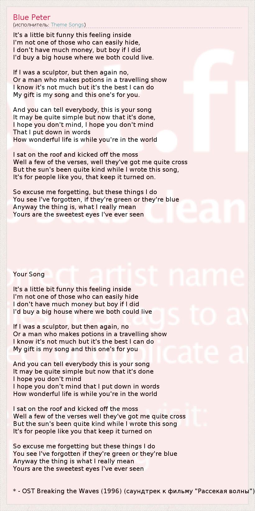 It's a little bit funny this feeling inside I'm not one of those who can easily hide, I don't have much money, but boy if I did I'd buy a big house where we both could live. If I was a sculptor, but then again no, Or a man who makes potions in a travelling show I know it's not much but it's the best I can do My gift is my song and this one's for you. And you can tell everybody, this is your song It may be quite simple but now that it's done, I hope you don't mind, I hope you don't mind That I put down in words How wonderful life is while you're in the world I sat on the roof and kicked off the moss Well a few of the verses, well they've got me quite cross But the sun's been quite kind while I wrote this song, It's for people like you, that keep it turned on. So excuse me forgetting, but these things I do You see I've forgotten, if they're green or they're blue Anyway the thing is, what I really mean Yours are the sweetest eyes I've ever seen Your Song It's a little bit funny this feeling inside I'm not one of those who can easily hide I don't have much money but boy if I did I'd buy a big house where we both could live If I was a sculptor, but then again, no Or a man who makes potions in a travelling show I know it's not much but it's the best I can do My gift is my song and this one's for you And you can tell everybody this is your song It may be quite simple but now that it's done I hope you don't mind I hope you don't mind that I put down in words How wonderful life is while you're in the world I sat on the roof and kicked off the moss Well a few of the verses well they've got me quite cross But the sun's been quite kind while I wrote this song It's for people like you that keep it turned on So excuse me forgetting but these things I do You see I've forgotten if they're green or they're blue Anyway the thing is what I really mean Yours are the sweetest eyes I've ever seen * - OST Breaking the Waves (1996) (саундтрек к фильму "Рассекая волны")