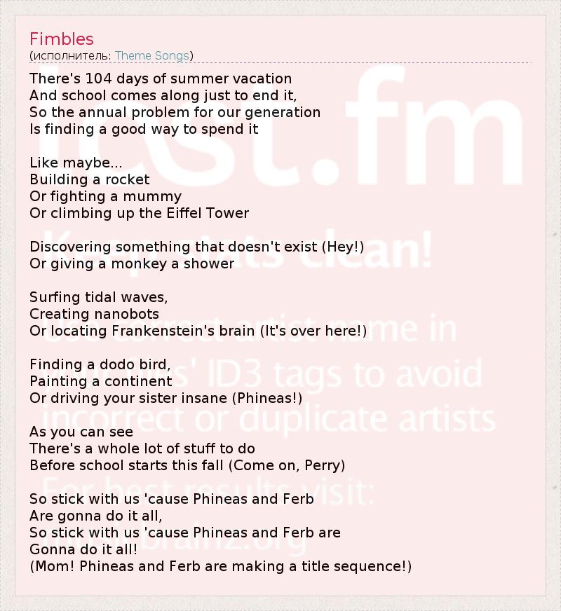 There's 104 days of summer vacation And school comes along just to end it, So the annual problem for our generation Is finding a good way to spend it Like maybe... Building a rocket Or fighting a mummy Or climbing up the Eiffel Tower Discovering something that doesn't exist (Hey!) Or giving a monkey a shower Surfing tidal waves, Creating nanobots Or locating Frankenstein's brain (It's over here!) Finding a dodo bird, Painting a continent Or driving your sister insane (Phineas!) As you can see There's a whole lot of stuff to do Before school starts this fall (Come on, Perry) So stick with us 'cause Phineas and Ferb Are gonna do it all, So stick with us 'cause Phineas and Ferb are Gonna do it all! (Mom! Phineas and Ferb are making a title sequence!)