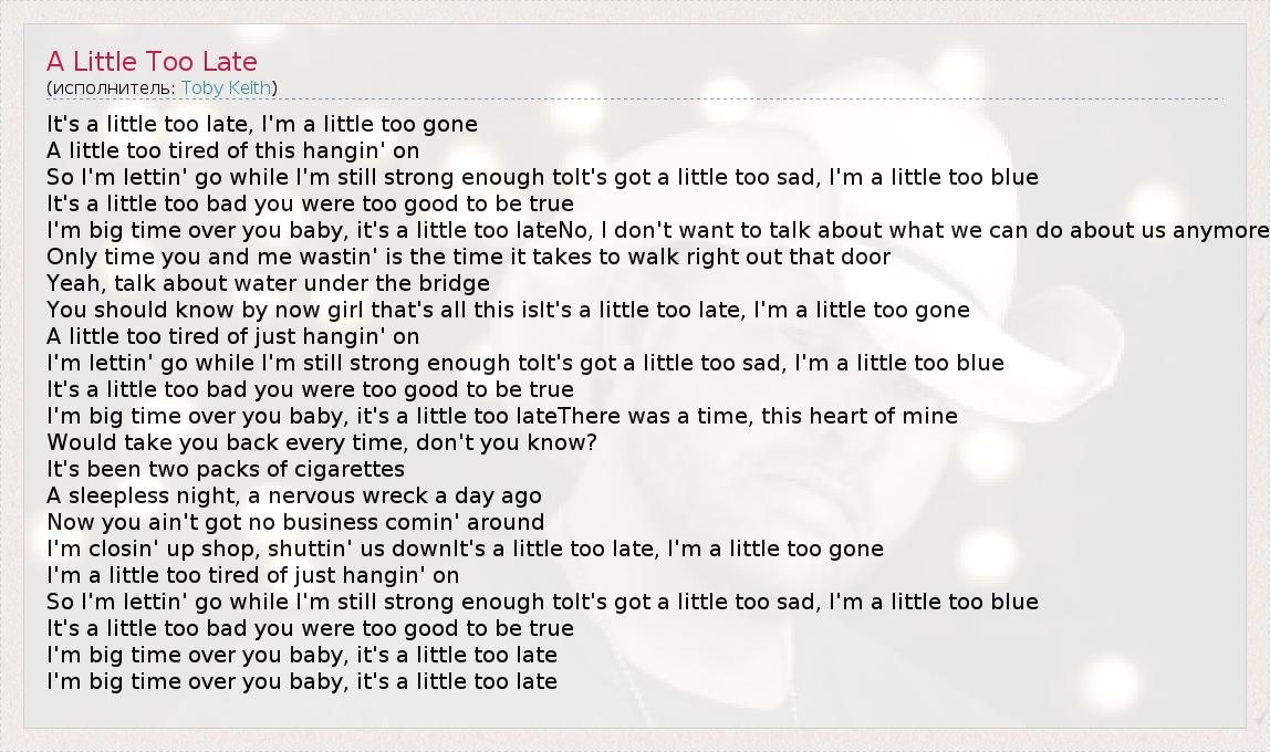 А как ты думаешь, о чем песня "A Little Too Late" ?