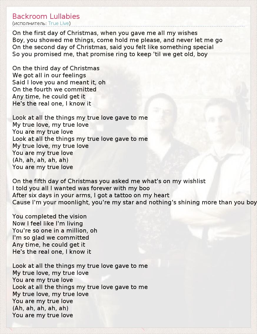В первый день Рождества ты исполнил все мои желания, Милый, ты показал мне то, что я никогда в жизни не видела. Давай, обними меня, пожалуйста, и никогда не отпускай. Во второй день Рождества ты сказал, что испытываешь нечто особенное, И пообещал мне руку и сердце, подарив кольцо, чтобы я носила его, пока мы не состаримся, милый. В третий день Рождества Мы с головой погрузились в наши чувства. Я сказала, что люблю тебя, и это серьезно. На четвертый день мы решили начать нашу совместную жизнь. Ты всегда можешь получить то, чего хочешь, Ты - тот единственный, и я знаю это. Посмотри на то, что мне подарила моя настоящая любовь, Моя настоящая любовь, моя настоящая любовь, Ты - моя настоящая любовь. Посмотри на то, что мне подарила моя настоящая любовь, Моя настоящая любовь, моя настоящая любовь, Ты - моя настоящая любовь. (Ах, ах, ах) Ты - моя настоящая любовь. В пятый день Рождества ты спросил меня, что я хочу в подарок, Я ответила, что я бы хотела всю жизнь прожить с тобой. После шестого дня в твоих объятиях я сделала татуировку на своем сердце, Ведь я твой лунный свет, а ты - моя звезда, и ничто не сияет ярче, чем ты, милый. Благодаря тебе паззл сложился, И теперь я чувствую всю красоту жизни. Ты - мой единственный, оу, Я так рада, что мы принадлежим друг другу. Ты всегда можешь получить то, чего хочешь, Ты - тот, кто мне нужен, и я знаю это. Посмотри на то, что подарила мне моя настоящая любовь, Моя настоящая любовь, настоящая любовь, Ты - моя настоящая любовь! Посмотри на то, что подарила мне моя настоящая любовь, Моя настоящая любовь, настоящая любовь, Ты - моя настоящая любовь! (Ах, ах, ах) Ты - моя настоящая любовь!