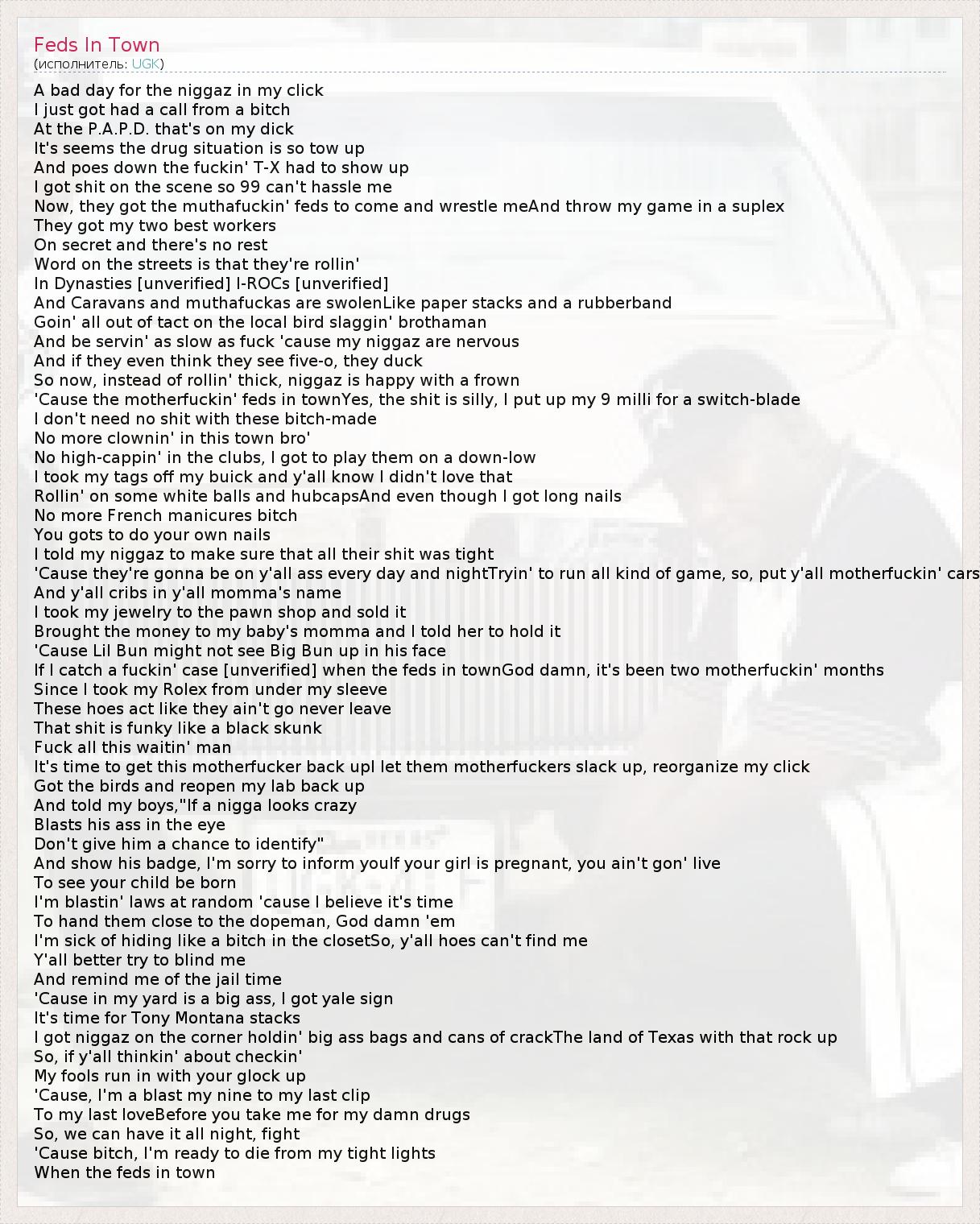 A bad day for the niggaz in my click I just got had a call from a bitch At the P.A.P.D. that's on my dick It's seems the drug situation is so tow up And poes down the fuckin' T-X had to show up I got shit on the scene so 99 can't hassle me Now, they got the muthafuckin' feds to come and wrestle meAnd throw my game in a suplex They got my two best workers On secret and there's no rest Word on the streets is that they're rollin' In Dynasties [unverified] I-ROCs [unverified] And Caravans and muthafuckas are swolenLike paper stacks and a rubberband Goin' all out of tact on the local bird slaggin' brothaman And be servin' as slow as fuck 'cause my niggaz are nervous And if they even think they see five-o, they duck So now, instead of rollin' thick, niggaz is happy with a frown 'Cause the motherfuckin' feds in townYes, the shit is silly, I put up my 9 milli for a switch-blade I don't need no shit with these bitch-made No more clownin' in this town bro' No high-cappin' in the clubs, I got to play them on a down-low I took my tags off my buick and y'all know I didn't love that Rollin' on some white balls and hubcapsAnd even though I got long nails No more French manicures bitch You gots to do your own nails I told my niggaz to make sure that all their shit was tight 'Cause they're gonna be on y'all ass every day and nightTryin' to run all kind of game, so, put y'all motherfuckin' cars And y'all cribs in y'all momma's name I took my jewelry to the pawn shop and sold it Brought the money to my baby's momma and I told her to hold it 'Cause Lil Bun might not see Big Bun up in his face If I catch a fuckin' case [unverified] when the feds in townGod damn, it's been two motherfuckin' months Since I took my Rolex from under my sleeve These hoes act like they ain't go never leave That shit is funky like a black skunk Fuck all this waitin' man It's time to get this motherfucker back upI let them motherfuckers slack up, reorganize my click Got the birds and reopen my lab back up And told my boys,"If a nigga looks crazy Blasts his ass in the eye Don't give him a chance to identify" And show his badge, I'm sorry to inform youIf your girl is pregnant, you ain't gon' live To see your child be born I'm blastin' laws at random 'cause I believe it's time To hand them close to the dopeman, God damn 'em I'm sick of hiding like a bitch in the closetSo, y'all hoes can't find me Y'all better try to blind me And remind me of the jail time 'Cause in my yard is a big ass, I got yale sign It's time for Tony Montana stacks I got niggaz on the corner holdin' big ass bags and cans of crackThe land of Texas with that rock up So, if y'all thinkin' about checkin' My fools run in with your glock up 'Cause, I'm a blast my nine to my last clip To my last loveBefore you take me for my damn drugs So, we can have it all night, fight 'Cause bitch, I'm ready to die from my tight lights When the feds in town