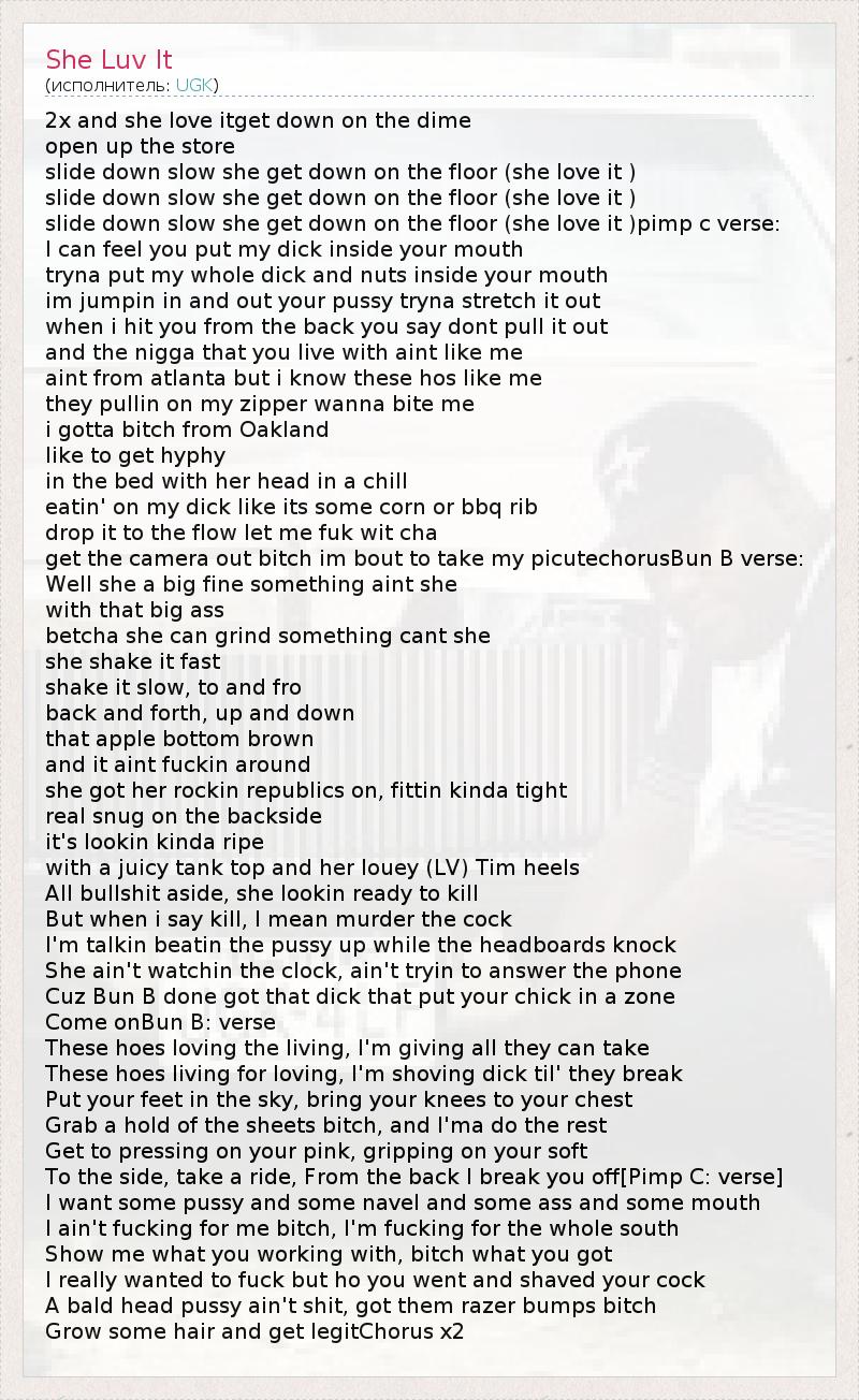 2x and she love itget down on the dime open up the store slide down slow she get down on the floor (she love it ) slide down slow she get down on the floor (she love it ) slide down slow she get down on the floor (she love it )pimp c verse: I can feel you put my dick inside your mouth tryna put my whole dick and nuts inside your mouth im jumpin in and out your pussy tryna stretch it out when i hit you from the back you say dont pull it out and the nigga that you live with aint like me aint from atlanta but i know these hos like me they pullin on my zipper wanna bite me i gotta bitch from Oakland like to get hyphy in the bed with her head in a chill eatin' on my dick like its some corn or bbq rib drop it to the flow let me fuk wit cha get the camera out bitch im bout to take my picutechorusBun B verse: Well she a big fine something aint she with that big ass betcha she can grind something cant she she shake it fast shake it slow, to and fro back and forth, up and down that apple bottom brown and it aint fuckin around she got her rockin republics on, fittin kinda tight real snug on the backside it's lookin kinda ripe with a juicy tank top and her louey (LV) Tim heels All bullshit aside, she lookin ready to kill But when i say kill, I mean murder the cock I'm talkin beatin the pussy up while the headboards knock She ain't watchin the clock, ain't tryin to answer the phone Cuz Bun B done got that dick that put your chick in a zone Come onBun B: verse These hoes loving the living, I'm giving all they can take These hoes living for loving, I'm shoving dick til' they break Put your feet in the sky, bring your knees to your chest Grab a hold of the sheets bitch, and I'ma do the rest Get to pressing on your pink, gripping on your soft To the side, take a ride, From the back I break you off[Pimp C: verse] I want some pussy and some navel and some ass and some mouth I ain't fucking for me bitch, I'm fucking for the whole south Show me what you working with, bitch what you got I really wanted to fuck but ho you went and shaved your cock A bald head pussy ain't shit, got them razer bumps bitch Grow some hair and get legitChorus x2