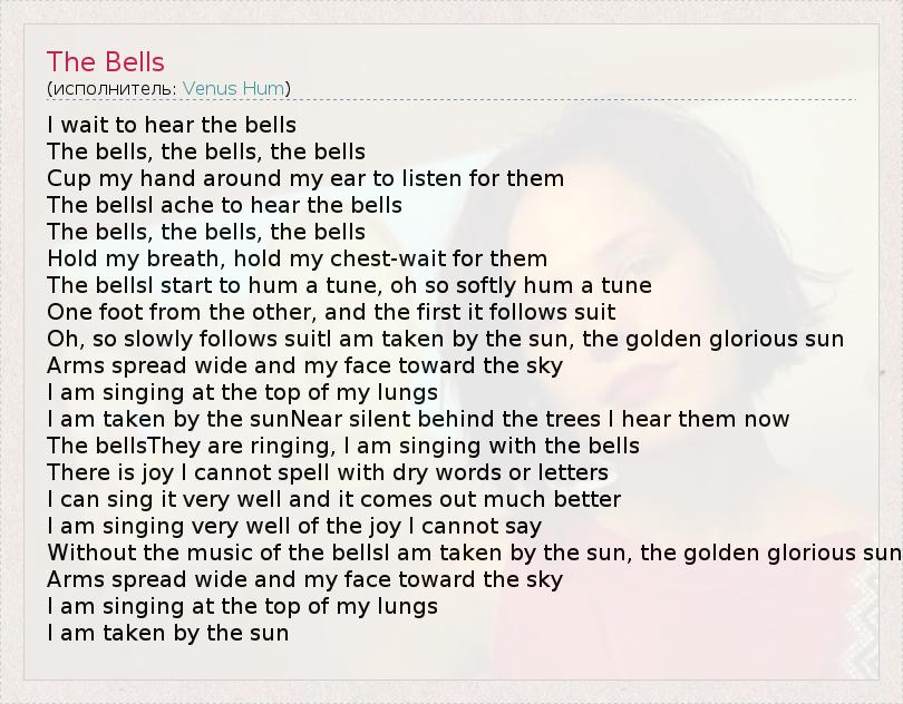 I wait to hear the bells The bells, the bells, the bells Cup my hand around my ear to listen for them The bellsI ache to hear the bells The bells, the bells, the bells Hold my breath, hold my chest-wait for them The bellsI start to hum a tune, oh so softly hum a tune One foot from the other, and the first it follows suit Oh, so slowly follows suitI am taken by the sun, the golden glorious sun Arms spread wide and my face toward the sky I am singing at the top of my lungs I am taken by the sunNear silent behind the trees I hear them now The bellsThey are ringing, I am singing with the bells There is joy I cannot spell with dry words or letters I can sing it very well and it comes out much better I am singing very well of the joy I cannot say Without the music of the bellsI am taken by the sun, the golden glorious sun Arms spread wide and my face toward the sky I am singing at the top of my lungs I am taken by the sun