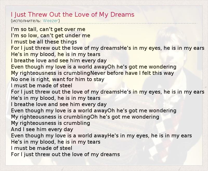 А как ты думаешь, о чем песня "I Just Threw Out the Love of My Dreams" ?