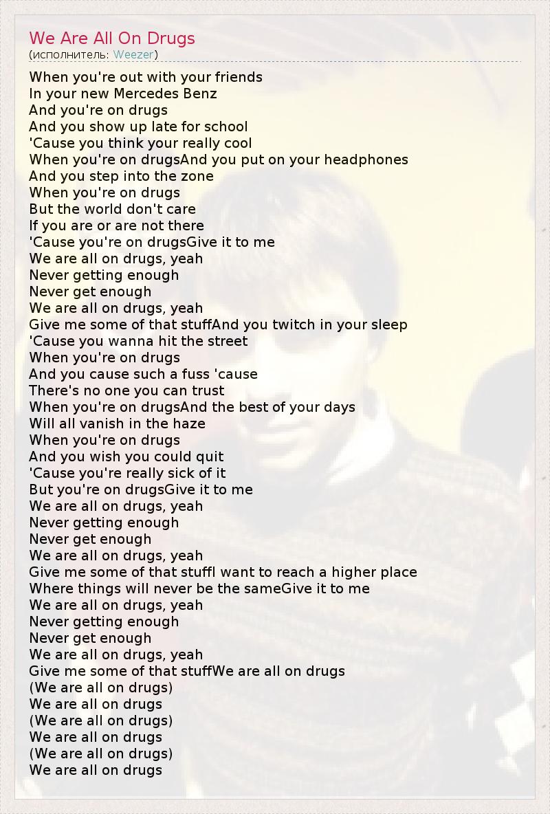 When you're out with your friends In your new Mercedes Benz And you're on drugs And you show up late for school 'Cause you think your really cool When you're on drugsAnd you put on your headphones And you step into the zone When you're on drugs But the world don't care If you are or are not there 'Cause you're on drugsGive it to me We are all on drugs, yeah Never getting enough Never get enough We are all on drugs, yeah Give me some of that stuffAnd you twitch in your sleep 'Cause you wanna hit the street When you're on drugs And you cause such a fuss 'cause There's no one you can trust When you're on drugsAnd the best of your days Will all vanish in the haze When you're on drugs And you wish you could quit 'Cause you're really sick of it But you're on drugsGive it to me We are all on drugs, yeah Never getting enough Never get enough We are all on drugs, yeah Give me some of that stuffI want to reach a higher place Where things will never be the sameGive it to me We are all on drugs, yeah Never getting enough Never get enough We are all on drugs, yeah Give me some of that stuffWe are all on drugs (We are all on drugs) We are all on drugs (We are all on drugs) We are all on drugs (We are all on drugs) We are all on drugs