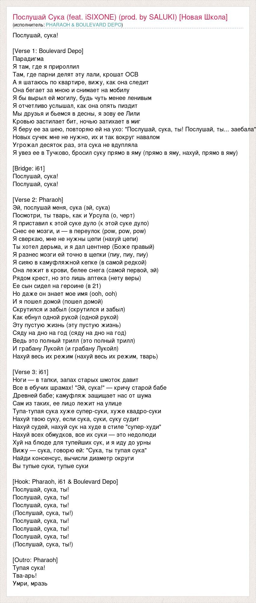 Послушай, сука! [Verse 1: Boulevard Depo] Парадигма Я там, где я прироллил Там, где парни делят эту лали, крошат OCB А я шатаюсь по квартире, вижу, как она следит Она бегает за мною и снимает на мобилу Я бы вырыл ей могилу, будь чуть менее ленивым Я отчетливо услышал, как она опять пиздит Мы друзья и бьемся в десны, я зову ее Лили Кровью застилает бит, ночью затихает в миг Я беру ее за шею, повторяю ей на ухо: "Послушай, сука, ты! Послушай, ты... заебала" Новых сучек мне не нужно, их и так вокруг навалом Угрожал десяток раз, эта сука не вдупляла Я увез ее в Тучково, бросил суку прямо в яму (прямо в яму, нахуй, прямо в яму) [Bridge: i61] Послушай, сука! Послушай, сука! [Verse 2: Pharaoh] Эй, послушай меня, сука (эй, сука) Посмотри, ты тварь, как и Урсула (о, черт) Я приставил к этой суке дуло (к этой суке дуло) Снес ее мозги, и — в переулок (pow, pow, pow) Я сверкаю, мне не нужны цепи (нахуй цепи) Ты хотел дерьма, и я дал центнер (Боже правый) Я разнес мозги ей точно в щепки (пиу, пиу, пиу) Я сияю в камуфляжной кепке (в самой редкой) Она лежит в крови, белее снега (самой первой, эй) Рядом крест, но это лишь аптека (нету веры) Ее сын сидел на героине (в 21) Но даже он знает мое имя (ooh, ooh) И я пошел домой (пошел домой) Скрутился и забыл (скрутился и забыл) Как ебнул одной рукой (одной рукой) Эту пустую жизнь (эту пустую жизнь) Сяду на дно на год (сяду на дно на год) Ведь это полный трилл (это полный трилл) И грабану Лукойл (и грабану Лукойл) Нахуй весь их режим (нахуй весь их режим, тварь) [Verse 3: i61] Ноги — в тапки, запах старых шмоток давит Все в ебучих шрамах! "Эй, сука!" — кричу старой бабе Древней бабе; камуфляж защищает нас от шума Сам из таких, ее лицо лежит на улице Тупа-тупая сука хуже супер-суки, хуже квадро-суки Нахуй твою суку, если сука, суки, суку судит Нахуй судей, нахуй сук на худе в стиле "супер-худи" Нахуй всех обмудков, все их суки — это недолюди Хуй на блюде для тупейших сук, и я иду до урны Вижу — сука, говорю ей: "Сука, ты тупая сука" Найди консенсус, вычисли диаметр округи Вы тупые суки, тупые суки [Hook: Pharaoh, i61 & Boulevard Depo] Послушай, сука, ты! Послушай, сука, ты! Послушай, сука, ты! (Послушай, сука, ты!) Послушай, сука, ты! Послушай, сука, ты! Послушай, сука, ты! (Послушай, сука, ты!) [Outro: Pharaoh] Тупая сука! Тва-арь! Умри, мразь