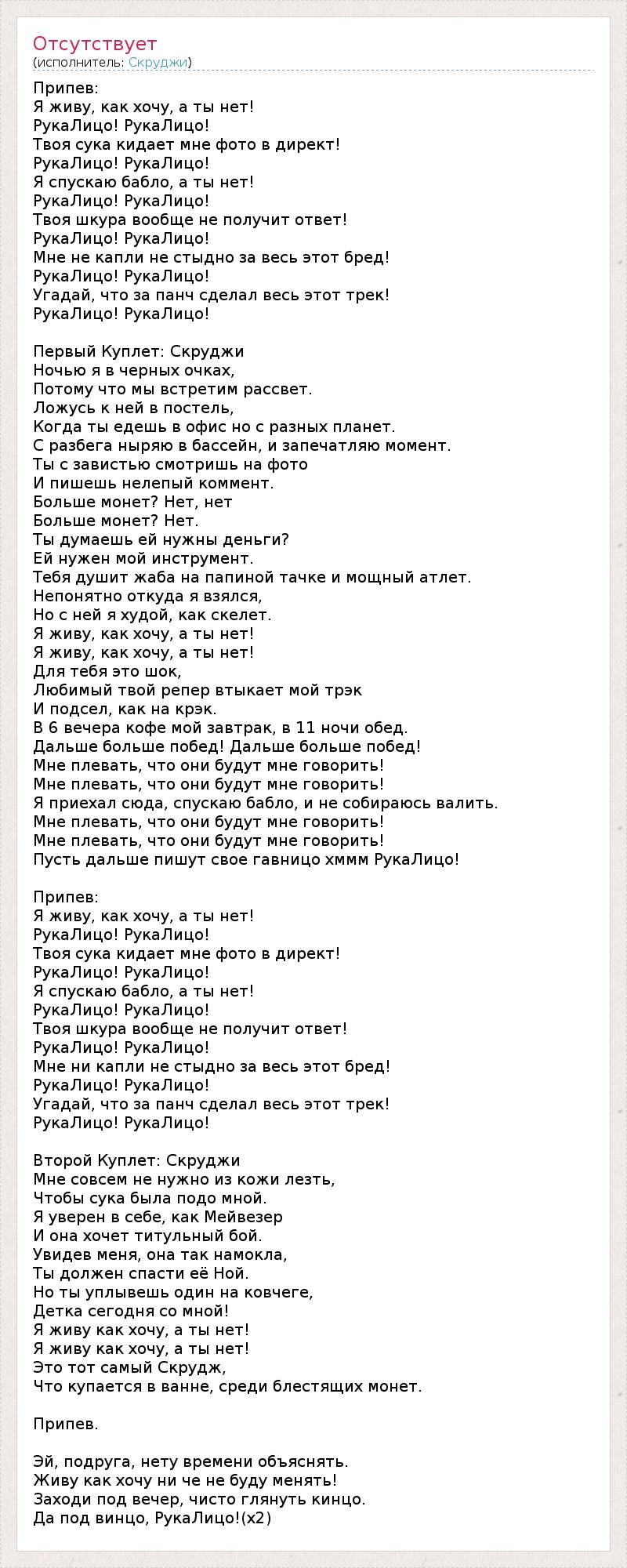 Припев: Я живу, как хочу, а ты нет! РукаЛицо! РукаЛицо! Твоя сука кидает мне фото в директ! РукаЛицо! РукаЛицо! Я спускаю бабло, а ты нет! РукаЛицо! РукаЛицо! Твоя шкура вообще не получит ответ! РукаЛицо! РукаЛицо! Мне не капли не стыдно за весь этот бред! РукаЛицо! РукаЛицо! Угадай, что за панч сделал весь этот трек! РукаЛицо! РукаЛицо! Первый Куплет: Скруджи Ночью я в черных очках, Потому что мы встретим рассвет. Ложусь к ней в постель, Когда ты едешь в офис но с разных планет. С разбега ныряю в бассейн, и запечатляю момент. Ты с завистью смотришь на фото И пишешь нелепый коммент. Больше монет? Нет, нет Больше монет? Нет. Ты думаешь ей нужны деньги? Ей нужен мой инструмент. Тебя душит жаба на папиной тачке и мощный атлет. Непонятно откуда я взялся, Но с ней я худой, как скелет. Я живу, как хочу, а ты нет! Я живу, как хочу, а ты нет! Для тебя это шок, Любимый твой репер втыкает мой трэк И подсел, как на крэк. В 6 вечера кофе мой завтрак, в 11 ночи обед. Дальше больше побед! Дальше больше побед! Мне плевать, что они будут мне говорить! Мне плевать, что они будут мне говорить! Я приехал сюда, спускаю бабло, и не собираюсь валить. Мне плевать, что они будут мне говорить! Мне плевать, что они будут мне говорить! Пусть дальше пишут свое гавницо хммм РукаЛицо! Припев: Я живу, как хочу, а ты нет! РукаЛицо! РукаЛицо! Твоя сука кидает мне фото в директ! РукаЛицо! РукаЛицо! Я спускаю бабло, а ты нет! РукаЛицо! РукаЛицо! Твоя шкура вообще не получит ответ! РукаЛицо! РукаЛицо! Мне ни капли не стыдно за весь этот бред! РукаЛицо! РукаЛицо! Угадай, что за панч сделал весь этот трек! РукаЛицо! РукаЛицо! Второй Куплет: Скруджи Мне совсем не нужно из кожи лезть, Чтобы сука была подо мной. Я уверен в себе, как Мейвезер И она хочет титульный бой. Увидев меня, она так намокла, Ты должен спасти её Ной. Но ты уплывешь один на ковчеге, Детка сегодня со мной! Я живу как хочу, а ты нет! Я живу как хочу, а ты нет! Это тот самый Скрудж, Что купается в ванне, среди блестящих монет. Припев. Эй, подруга, нету времени объяснять. Живу как хочу ни че не буду менять! Заходи под вечер, чисто глянуть кинцо. Да под винцо, РукаЛицо!(х2)