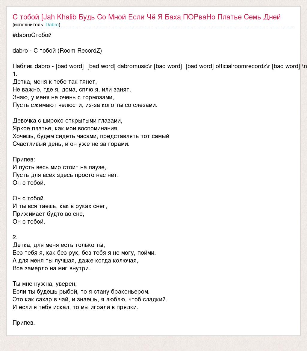 #dabroСтобой dabro - С тобой (Room RecordZ) Паблик dabro - [bad word] [bad word] dabromusic\r [bad word] [bad word] officialroomrecordz\r [bad word] \n 1. Детка, меня к тебе так тянет, Не важно, где я, дома, сплю я, или занят. Знаю, у меня не очень с тормозами, Пусть сжимают челюсти, из-за кого ты со слезами. Девочка с широко открытыми глазами, Яркое платье, как мои воспоминания. Хочешь, будем сидеть часами, представлять тот самый Счастливый день, и он уже не за горами. Припев: И пусть весь мир стоит на паузе, Пусть для всех здесь просто нас нет. Он с тобой. Он с тобой. И ты вся таешь, как в руках снег, Прижимает будто во сне, Он с тобой. 2. Детка, для меня есть только ты, Без тебя я, как без рук, без тебя я не могу, пойми. А для меня ты лучшая, даже когда колючая, Все замерло на миг внутри. Ты мне нужна, уверен, Если ты будешь рыбой, то я стану браконьером. Это как сахар в чай, и знаешь, я люблю, чтоб сладкий. И если я тебя искал, то мы играли в прядки. Припев.