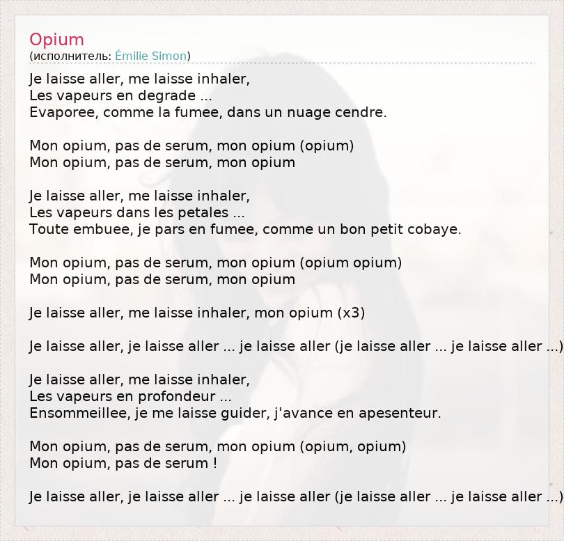 Je laisse aller, me laisse inhaler, mon opium (x3)