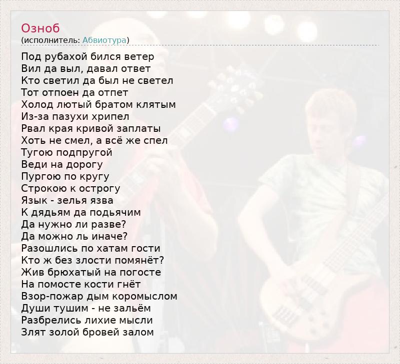 Это интересно:Стиль: этно-кор Состав: Павел Лапыгин – песни, голос, гитара, Андрей Шеремет – бас, компьютеры Роман Коробейников – соло гитара, хомус Александр Яковлев - барабаны, перкуссия Алексей Яковлев - звук Сайт:http://abviotura.ru ЖЖ:http://community.livejournal.com/abviotura/ О группе: АБВИОТУРА основана в г. Ростове-на-Дону... продолжение