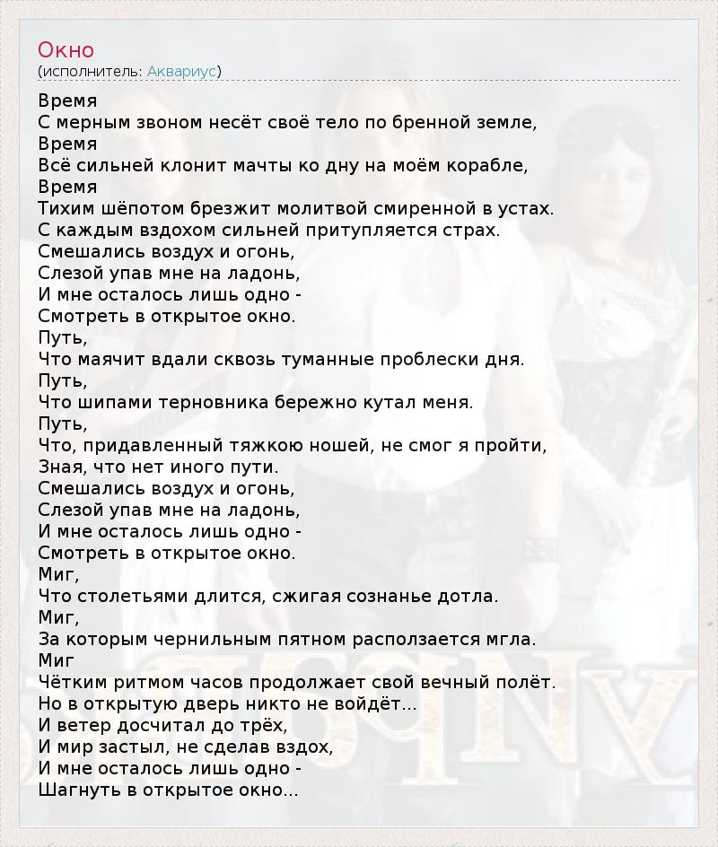 Время С мерным звоном несёт своё тело по бренной земле, Время Всё сильней клонит мачты ко дну на моём корабле, Время Тихим шёпотом брезжит молитвой смиренной в устах. С каждым вздохом сильней притупляется страх. Смешались воздух и огонь, Слезой упав мне на ладонь, И мне осталось лишь одно - Смотреть в открытое окно. Путь, Что маячит вдали сквозь туманные проблески дня. Путь, Что шипами терновника бережно кутал меня. Путь, Что, придавленный тяжкою ношей, не смог я пройти, Зная, что нет иного пути. Смешались воздух и огонь, Слезой упав мне на ладонь, И мне осталось лишь одно - Смотреть в открытое окно. Миг, Что столетьями длится, сжигая сознанье дотла. Миг, За которым чернильным пятном расползается мгла. Миг Чётким ритмом часов продолжает свой вечный полёт. Но в открытую дверь никто не войдёт... И ветер досчитал до трёх, И мир застыл, не сделав вздох, И мне осталось лишь одно - Шагнуть в открытое окно...
