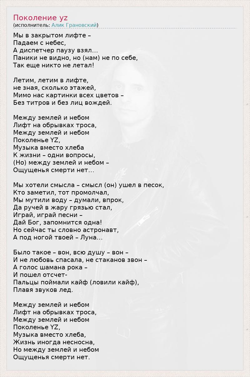 Мы в закрытом лифте – Падаем с небес, А диспетчер паузу взял… Паники не видно, но (нам) не по себе, Так еще никто не летал! Летим, летим в лифте, не зная, сколько этажей, Мимо нас картинки всех цветов – Без титров и без лиц вождей. Между землей и небом Лифт на обрывках троса, Между землей и небом Поколенье YZ, Музыка вместо хлеба К жизни – одни вопросы, (Но) между землей и небом – Ощущенья смерти нет… Мы хотели смысла – смысл (он) ушел в песок, Кто заметил, тот промолчал, Мы мутили воду – думали, впрок, Да ручей в жару грязью стал, Играй, играй песни – Дай Бог, запомнится одна! Но сейчас ты словно астронавт, А под ногой твоей – Луна… Было такое – вон, всю душу – вон – И не любовь спасала, не стаканов звон – А голос шамана рока – И пошел отсчет- Пальцы поймали кайф (ловили кайф), Плавя звуков лед. Между землей и небом Лифт на обрывках троса, Между землей и небом Поколенье YZ, Музыка вместо хлеба, Жизнь иногда несносна, Но между землей и небом Ощущенья смерти нет.