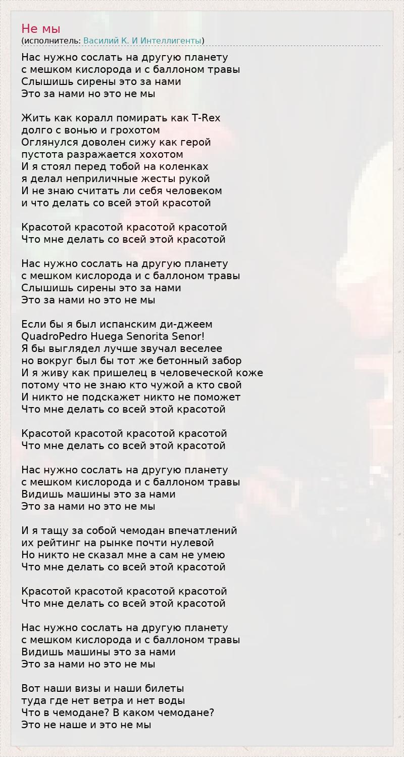Это интересно:Нет исполнителя «Василий К. и Интеллигенты», есть исполнитель «Василий К. & Интеллигенты». Пожалуйста, исправьте теги.