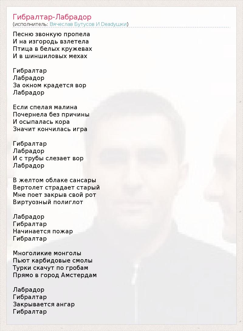 Песню звонкую пропела И на изгородь взлетела Птица в белых кружевах И в шиншиловых мехах Гибралтар Лабрадор За окном крадется вор Лабрадор Если спелая малина Почернела без причины И осыпалась кора Значит кончилась игра Гибралтар Лабрадор И с трубы слезает вор Лабрадор В желтом облаке сансары Вертолет страдает старый Мне поет закрыв свой рот Виртуозный полиглот Лабрадор Гибралтар Начинается пожар Гибралтар Многоликие монголы Пьют карбидовые смолы Турки скачут по гробам Прямо в город Амстердам Лабрадор Гибралтар Закрывается ангар Гибралтар