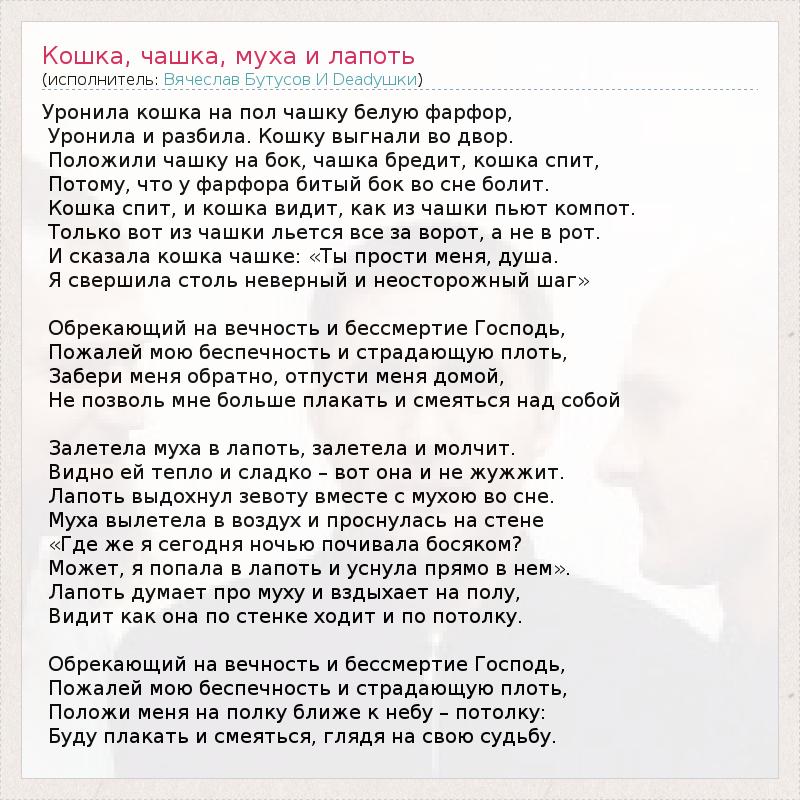 Уронила кошка на пол чашку белую фарфор, Уронила и разбила. Кошку выгнали во двор. Положили чашку на бок, чашка бредит, кошка спит, Потому, что у фарфора битый бок во сне болит. Кошка спит, и кошка видит, как из чашки пьют компот. Только вот из чашки льется все за ворот, а не в рот. И сказала кошка чашке: «Ты прости меня, душа. Я свершила столь неверный и неосторожный шаг» Обрекающий на вечность и бессмертие Господь, Пожалей мою беспечность и страдающую плоть, Забери меня обратно, отпусти меня домой, Не позволь мне больше плакать и смеяться над собой Залетела муха в лапоть, залетела и молчит. Видно ей тепло и сладко – вот она и не жужжит. Лапоть выдохнул зевоту вместе с мухою во сне. Муха вылетела в воздух и проснулась на стене «Где же я сегодня ночью почивала босяком? Может, я попала в лапоть и уснула прямо в нем». Лапоть думает про муху и вздыхает на полу, Видит как она по стенке ходит и по потолку. Обрекающий на вечность и бессмертие Господь, Пожалей мою беспечность и страдающую плоть, Положи меня на полку ближе к небу – потолку: Буду плакать и смеяться, глядя на свою судьбу.