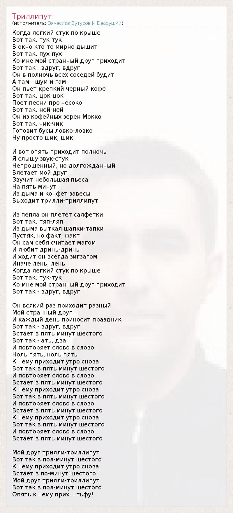 Когда легкий стук по крыше Вот так: тук-тук В окно кто-то мирно дышит Вот так: пух-пух Ко мне мой странный друг приходит Вот так - вдруг, вдруг Он в полночь всех соседей будит А там - шум и гам Он пьет крепкий черный кофе Вот так: цок-цок Поет песни про чесоко Вот так: ней-ней Он из кофейных зерен Мокко Вот так: чик-чик Готовит бусы ловко-ловко Ну просто шик, шик И вот опять приходит полночь Я слышу звук-стук Непрошенный, но долгожданный Влетает мой друг Звучит небольшая пьеса На пять минут Из дыма и конфет завесы Выходит трилли-триллипут Из пепла он плетет салфетки Вот так: тяп-ляп Из дыма выткал шапки-тапки Пустяк, но факт, факт Он сам себя считает магом И любит дринь-дринь И ходит он всегда зигзагом Иначе лень, лень Когда легкий стук по крыше Вот так: тук-тук Ко мне мой странный друг приходит Вот так - вдруг, вдруг Он всякий раз приходит разный Мой странный друг И каждый день приносит праздник Вот так - вдруг, вдруг Встает в пять минут шестого Вот так - ать, два И повторяет слово в слово Ноль пять, ноль пять К нему приходит утро снова Вот так в пять минут шестого И повторяет слово в слово Встает в пять минут шестого К нему приходит утро снова Вот так в пять минут шестого И повторяет слово в слово Встает в пять минут шестого К нему приходит утро снова Вот так в пять минут шестого И повторяет слово в слово Встает в пять минут шестого Мой друг трилли-триллипут Вот так в пол-минут шестого К нему приходит утро снова Встает в по-минут шестого Мой друг трилли-триллипут Вот так в пол-минут шестого Опять к нему прих... тьфу!