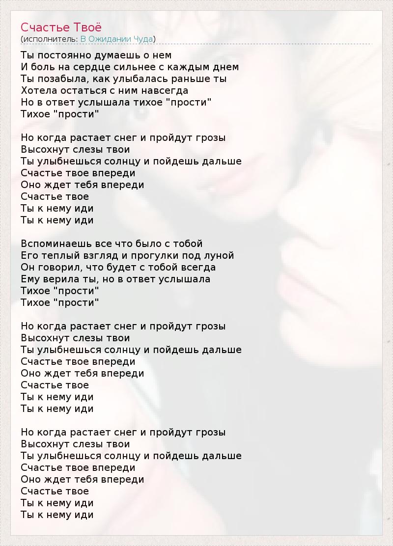 Ты постоянно думаешь о нем И боль на сердце сильнее с каждым днем Ты позабыла, как улыбалась раньше ты Хотела остаться с ним навсегда Но в ответ услышала тихое "прости" Тихое "прости" Но когда растает снег и пройдут грозы Высохнут слезы твои Ты улыбнешься солнцу и пойдешь дальше Счастье твое впереди Оно ждет тебя впереди Счастье твое Ты к нему иди Ты к нему иди Вспоминаешь все что было с тобой Его теплый взгляд и прогулки под луной Он говорил, что будет с тобой всегда Ему верила ты, но в ответ услышала Тихое "прости" Тихое "прости" Но когда растает снег и пройдут грозы Высохнут слезы твои Ты улыбнешься солнцу и пойдешь дальше Счастье твое впереди Оно ждет тебя впереди Счастье твое Ты к нему иди Ты к нему иди Но когда растает снег и пройдут грозы Высохнут слезы твои Ты улыбнешься солнцу и пойдешь дальше Счастье твое впереди Оно ждет тебя впереди Счастье твое Ты к нему иди Ты к нему иди