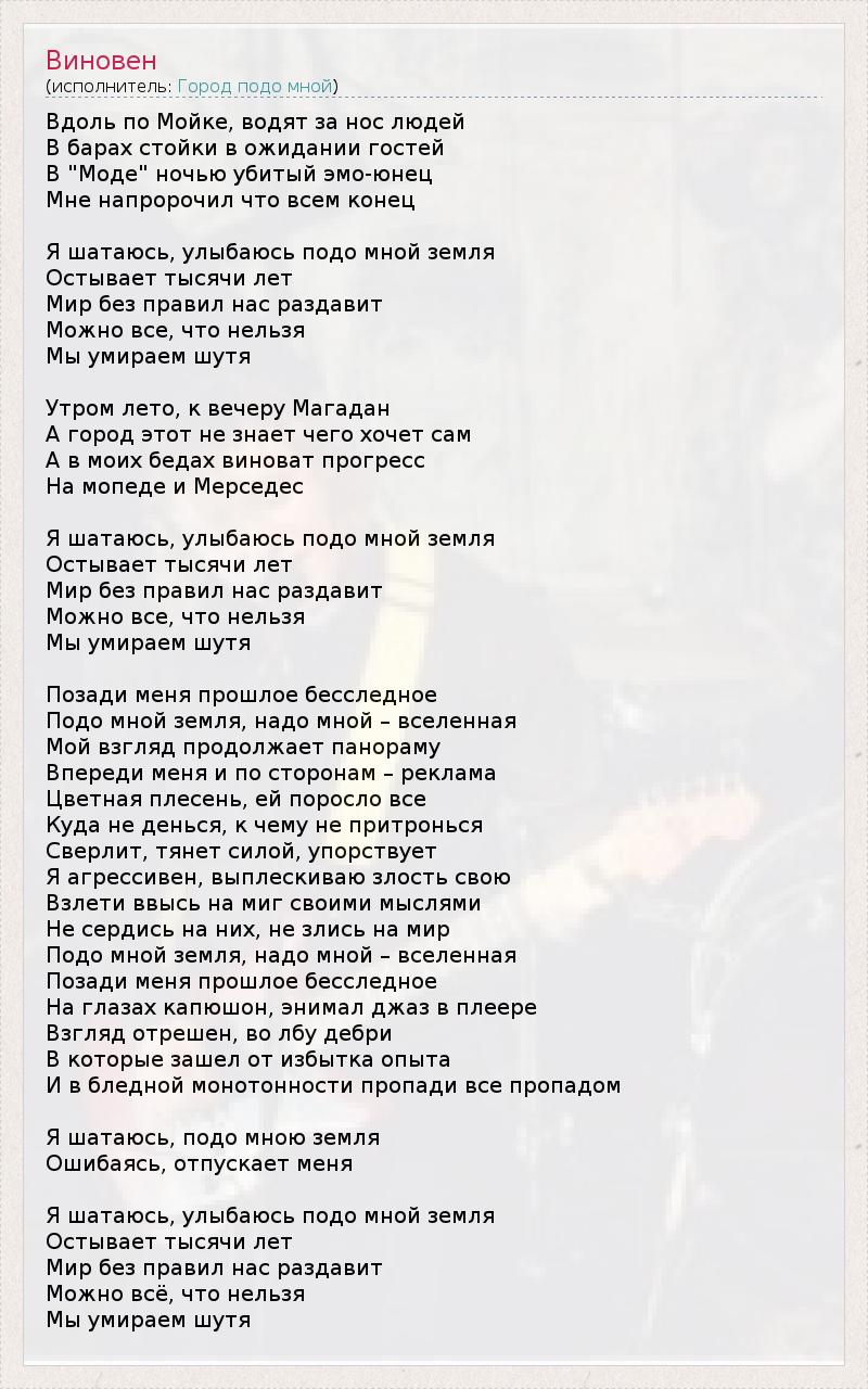 Это интересно:Город подо мной (2002-2012)Группа была образована в 2002 году гитаристом Алексеем Никоновым и барабанщиком Сергеем Райковым, до этого вместе игравшими в группе «Облако Фтора». Басистом стал Игорь Лавриков, а функцию вокалиста взял на себя Алексей. Свой стиль ребята определили как британский рок с элементами гранжа.В феврале 2003 года Игорь ушёл из группы, и Алексей с Сергеем занялись поисками... продолжение