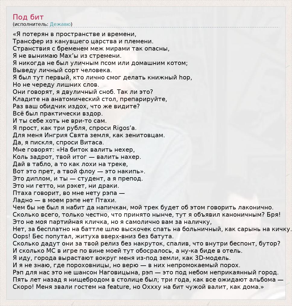 «Я потерян в пространстве и времени, Трансфер из канувшего царства и племени. Странствия с бременем меж мирами так опасны, Я не вынимаю Max’ы из стремени. Я никогда не был уличным псом или домашним котом; Выведу личный сорт человека. Я был тут первый, кто лично смог делать книжный hop, Но не череду лишних слов. Они говорят, я двуличный сноб. Так ли это? Кладите на анатомический стол, препарируйте, Раз ваш обидчик издох, что же видите? Всё был практически вздор. И ты себе хоть не ври-то сам. Я прост, как три рубля, спроси Rigos’а. Для меня Ингрия Свята земля, как зенитовцам. Да, я пискля, спроси Витаса. Мне говорят: «На биток валить нехер, Коль задрот, твой итог — валить нахер. Дай в табло, а то как лохи на треке, Вот это прет, а твой флоу — это накипь». Это диплом, и ты — студент, а я препод. Это ни гетто, ни рэкет, ни драки. Птаха говорит, во мне нету рэпа — Ладно — в моем рэпе нет Птахи. Чем бы не был я набит да напичкан, мой трек будет об этом говорить лаконично. Сколько всего, только честно, что принято нынче, тут я объявил каноничным? Бря! Это не моя партийная кличка, но я самолично вам за наличку, Нет, за бесплатно на баттле шлю выскочек спать на больничный, как сарынь на кичку. Oops! Бес попутал, житуха вверх-вниз без батута. Сколько дадут они за твой релиз без накруток, спалив, что внутри беспонт, бутор? И сколько МС в игре по вине моей тут обосралось, а ну-ка биде в отель. Я иду, города вырастают вокруг меня из-под земли, как 3D-модель. И я не знаю, где пороховницы, но верю — в них непромокаемый порох. Рэп для нас это не шансон Наговицына, рэп — это под небом неприкаянный город. Пять лет назад я нищебродом в столице был; три года, как все ожидают альбома — Скоро! Меня звали гостем на feature, но Oxxxy на бит чужой валит, как дома.»