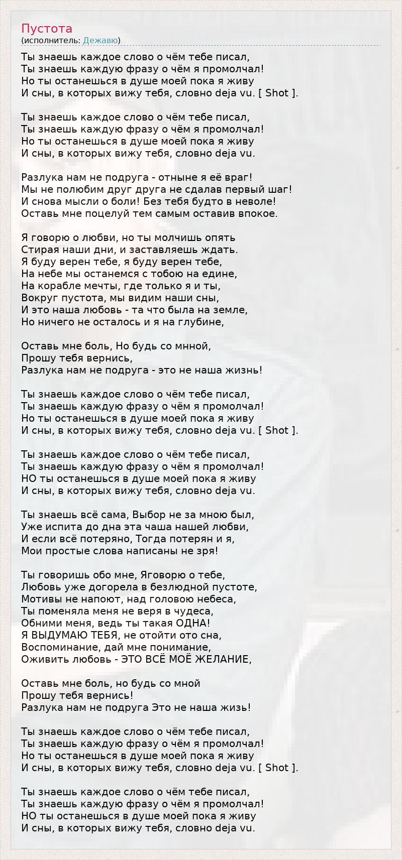 Ты знаешь каждое слово о чём тебе писал, Ты знаешь каждую фразу о чём я промолчал! Но ты останешься в душе моей пока я живу И сны, в которых вижу тебя, словно deja vu. [ Shot ]. Ты знаешь каждое слово о чём тебе писал, Ты знаешь каждую фразу о чём я промолчал! Но ты останешься в душе моей пока я живу И сны, в которых вижу тебя, словно deja vu. Разлука нам не подруга - отныне я её враг! Мы не полюбим друг друга не сдалав первый шаг! И снова мысли о боли! Без тебя будто в неволе! Оставь мне поцелуй тем самым оставив впокое. Я говорю о любви, но ты молчишь опять Стирая наши дни, и заставляешь ждать. Я буду верен тебе, я буду верен тебе, На небе мы останемся с тобою на едине, На корабле мечты, где только я и ты, Вокруг пустота, мы видим наши сны, И это наша любовь - та что была на земле, Но ничего не осталось и я на глубине, Оставь мне боль, Но будь со мнной, Прошу тебя вернись, Разлука нам не подруга - это не наша жизнь! Ты знаешь каждое слово о чём тебе писал, Ты знаешь каждую фразу о чём я промолчал! Но ты останешься в душе моей пока я живу И сны, в которых вижу тебя, словно deja vu. [ Shot ]. Ты знаешь каждое слово о чём тебе писал, Ты знаешь каждую фразу о чём я промолчал! НО ты останешься в душе моей пока я живу И сны, в которых вижу тебя, словно deja vu. Ты знаешь всё сама, Выбор не за мною был, Уже испита до дна эта чаша нашей любви, И если всё потеряно, Тогда потерян и я, Мои простые слова написаны не зря! Ты говоришь обо мне, Яговорю о тебе, Любовь уже догорела в безлюдной пустоте, Мотивы не напоют, над головою небеса, Ты поменяла меня не веря в чудеса, Обними меня, ведь ты такая ОДНА! Я ВЫДУМАЮ ТЕБЯ, не отойти ото сна, Воспоминание, дай мне понимание, Оживить любовь - ЭТО ВСЁ МОЁ ЖЕЛАНИЕ, Оставь мне боль, но будь со мной Прошу тебя вернись! Разлука нам не подруга Это не наша жизь! Ты знаешь каждое слово о чём тебе писал, Ты знаешь каждую фразу о чём я промолчал! Но ты останешься в душе моей пока я живу И сны, в которых вижу тебя, словно deja vu. [ Shot ]. Ты знаешь каждое слово о чём тебе писал, Ты знаешь каждую фразу о чём я промолчал! НО ты останешься в душе моей пока я живу И сны, в которых вижу тебя, словно deja vu.