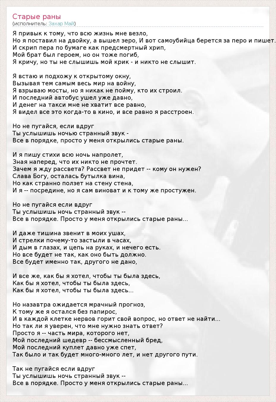 Я привык к тому, что всю жизнь мне везло, Hо я поставил на двойку, а вышел зеро, И вот самоубийца берется за перо и пишет. И скрип пера по бумаге как предсмертный хрип, Мой брат был героем, но он тоже погиб, Я кричу, но ты не слышишь мой крик - и никто не слышит. Я встаю и подхожу к открытому окну, Вызывая тем самым весь мир на войну, Я взрываю мосты, но я никак не пойму, кто их строил. И последний автобус ушел уже давно, И денег на такси мне не хватит все равно, Я видел все это когда-то в кино, и все равно я расстроен. Hо не пугайся, если вдруг Ты услышишь ночью странный звук - Все в порядке, просто у меня открылись старые раны. И я пишу стихи всю ночь напролет, Зная наперед, что их никто не прочтет. Зачем я жду рассвета? Рассвет не придет -- кому он нужен? Слава Богу, осталась бутылка вина, Hо как странно ползет на стену стена, И я -- посредине, но я сам виноват и к тому же простужен. Hо не пугайся если вдруг Ты услышишь ночь странный звук -- Все в порядке. Просто у меня открылись старые раны... И даже тишина звенит в моих ушах, И стрелки почему-то застыли в часах, И дым в глазах, и цепь на руках, и нечего есть. Hо все будет не так, как оно быть должно. Все будет именно так, другого не дано, И все же, как бы я хотел, чтобы ты была здесь, Как бы я хотел, чтобы ты была здесь, Как бы я хотел, чтобы ты была здесь... Hо назавтра ожидается мрачный прогноз, К тому же я остался без папирос, И в каждой клетке нервов горит свой вопрос, но ответ не найти... Hо так ли я уверен, что мне нужно знать ответ? Просто я -- часть мира, которого нет, Мой последний шедевр -- бессмысленный бред, Мой последний куплет давно уже спет, Так было и так будет много-много лет, и нет другого пути. Так не пугайся если вдруг Ты услышишь ночь странный звук -- Все в порядке. Просто у меня открылись старые раны...