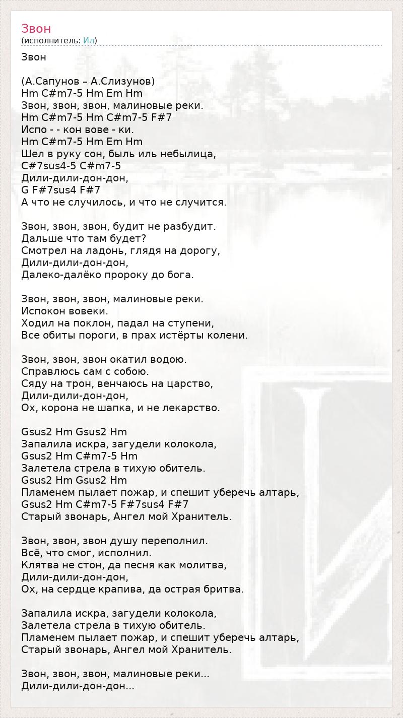 Звон (А.Сапунов – А.Слизунов) Hm C#m7-5 Hm Em Hm Звон, звон, звон, малиновые реки. Hm C#m7-5 Hm C#m7-5 F#7 Испо - - кон вове - ки. Hm C#m7-5 Hm Em Hm Шел в руку сон, быль иль небылица, C#7sus4-5 C#m7-5 Дили-дили-дон-дон, G F#7sus4 F#7 А что не случилось, и что не случится. Звон, звон, звон, будит не разбудит. Дальше что там будет? Смотрел на ладонь, глядя на дорогу, Дили-дили-дон-дон, Далеко-далёко пророку до бога. Звон, звон, звон, малиновые реки. Испокон вовеки. Ходил на поклон, падал на ступени, Все обиты пороги, в прах истёрты колени. Звон, звон, звон окатил водою. Справлюсь сам с собою. Сяду на трон, венчаюсь на царство, Дили-дили-дон-дон, Ох, корона не шапка, и не лекарство. Gsus2 Hm Gsus2 Hm Запалила искра, загудели колокола, Gsus2 Hm C#m7-5 Hm Залетела стрела в тихую обитель. Gsus2 Hm Gsus2 Hm Пламенем пылает пожар, и спешит уберечь алтарь, Gsus2 Hm C#m7-5 F#7sus4 F#7 Старый звонарь, Ангел мой Хранитель. Звон, звон, звон душу переполнил. Всё, что смог, исполнил. Клятва не стон, да песня как молитва, Дили-дили-дон-дон, Ох, на сердце крапива, да острая бритва. Запалила искра, загудели колокола, Залетела стрела в тихую обитель. Пламенем пылает пожар, и спешит уберечь алтарь, Старый звонарь, Ангел мой Хранитель. Звон, звон, звон, малиновые реки... Дили-дили-дон-дон...