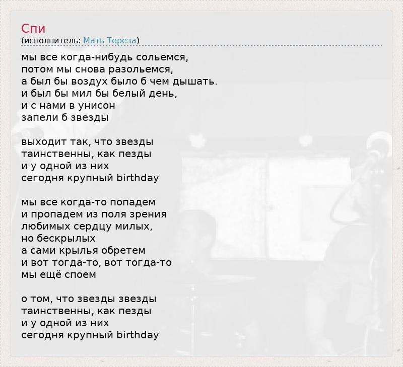 мы все когда-нибудь сольемся, потом мы снова разольемся, а был бы воздух было б чем дышать. и был бы мил бы белый день, и с нами в унисон запели б звезды выходит так, что звезды таинственны, как пезды и у одной из них сегодня крупный birthday мы все когда-то попадем и пропадем из поля зрения любимых сердцу милых, но бескрылых а сами крылья обретем и вот тогда-то, вот тогда-то мы ещё споем о том, что звезды звезды таинственны, как пезды и у одной из них сегодня крупный birthday