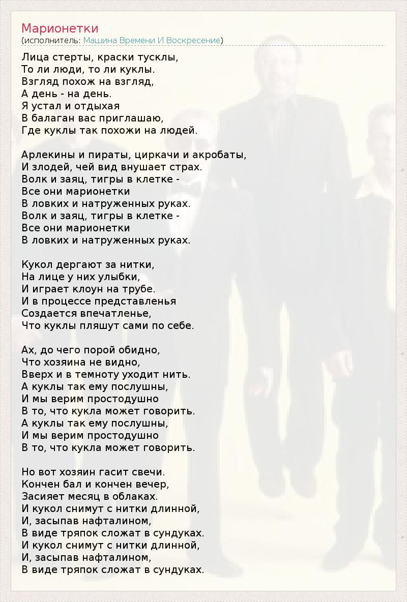 Лица стерты, краски тусклы, То ли люди, то ли куклы. Взгляд похож на взгляд, А день - на день. Я устал и отдыхая В балаган вас приглашаю, Где куклы так похожи на людей. Арлекины и пираты, циркачи и акробаты, И злодей, чей вид внушает страх. Волк и заяц, тигры в клетке - Все они марионетки В ловких и натруженных руках. Волк и заяц, тигры в клетке - Все они марионетки В ловких и натруженных руках. Кукол дергают за нитки, На лице у них улыбки, И играет клоун на трубе. И в процессе представленья Создается впечатленье, Что куклы пляшут сами по себе. Ах, до чего порой обидно, Что хозяина не видно, Вверх и в темноту уходит нить. А куклы так ему послушны, И мы верим простодушно В то, что кукла может говорить. А куклы так ему послушны, И мы верим простодушно В то, что кукла может говорить. Но вот хозяин гасит свечи. Кончен бал и кончен вечер, Засияет месяц в облаках. И кукол снимут с нитки длинной, И, засыпав нафталином, В виде тряпок сложат в сундуках. И кукол снимут с нитки длинной, И, засыпав нафталином, В виде тряпок сложат в сундуках. Машина времени - Марионетки - Текст песни, слушать онлайн Машина времени - Марионетки - Текст песни, слушать онлайн