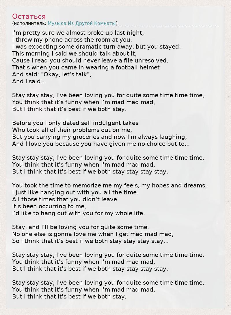 Stay stay stay, I've been loving you for quite some time time time.