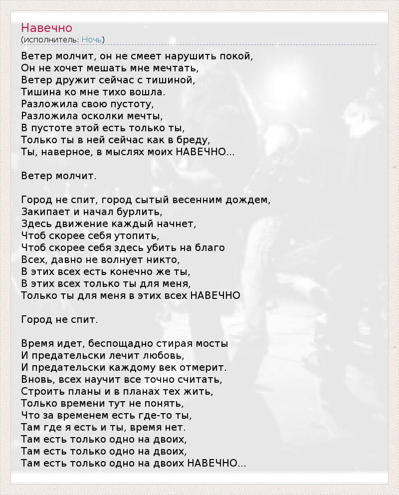 Ветер молчит, он не смеет нарушить покой, Он не хочет мешать мне мечтать, Ветер дружит сейчас с тишиной, Тишина ко мне тихо вошла. Разложила свою пустоту, Разложила осколки мечты, В пустоте этой есть только ты, Только ты в ней сейчас как в бреду, Ты, наверное, в мыслях моих НАВЕЧНО... Ветер молчит. Город не спит, город сытый весенним дождем, Закипает и начал бурлить, Здесь движение каждый начнет, Чтоб скорее себя утопить, Чтоб скорее себя здесь убить на благо Всех, давно не волнует никто, В этих всех есть конечно же ты, В этих всех только ты для меня, Только ты для меня в этих всех НАВЕЧНО Город не спит. Время идет, беспощадно стирая мосты И предательски лечит любовь, И предательски каждому век отмерит. Вновь, всех научит все точно считать, Строить планы и в планах тех жить, Только времени тут не понять, Что за временем есть где-то ты, Там где я есть и ты, время нет. Там есть только одно на двоих, Там есть только одно на двоих, Там есть только одно на двоих НАВЕЧНО...