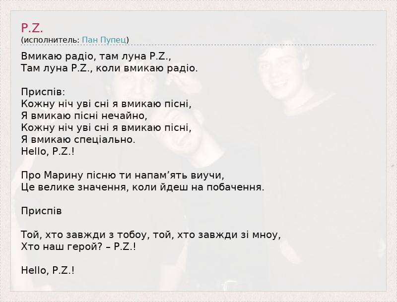 Vmikayu radіo , where the moon P.Z., There moon PZ, if vmikayu radіo . Prispіv : Cutaneous nich uvі snі I vmikayu pisni , I vmikayu pisni nechayno , Cutaneous nich uvі snі I vmikayu pisni , I vmikayu spetsіalno . Hello, P.Z.! About Marina pіsnyu minute napam'yat viuchi , End of the great significance , if ydesh on pobachennya . Prispіv One hto zavzhdi s Tobo , one hto zavzhdi Zi mnou , Hto our hero ? - P.Z.! Hello, P.Z.!