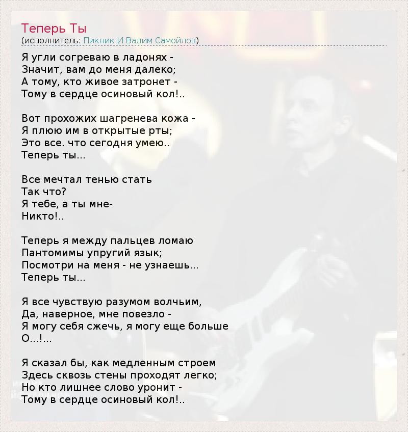 Это интересно:В 2004 году группа Пикник выпустила альбом "Тень Вампира", записанный совместно с Вадимом Самойловым (Агата Кристи).